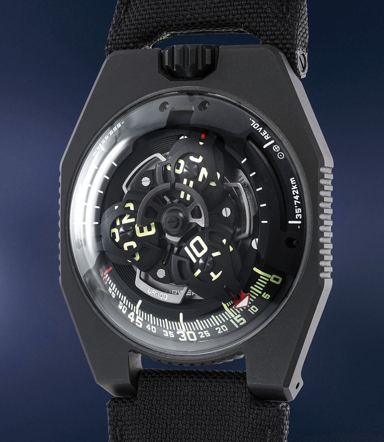 The UR 100 Spacetime does indicate time however, via the signature rotating discs.