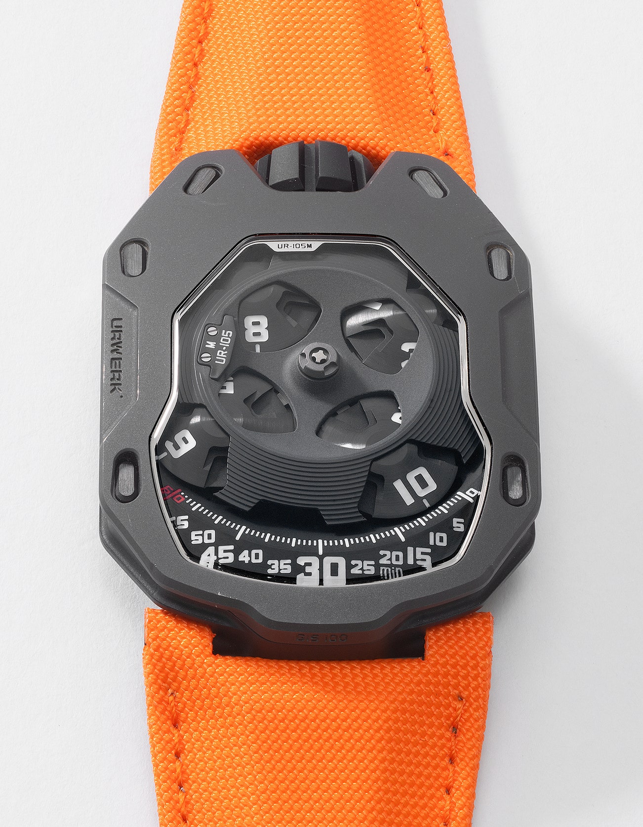 In 2014, Urwerk launched the limited edition UR-105M in two variations – the Iron Knight with a brushed steel armor bezel, and the Dark Knight with a black AITiN-treated steel armor bezel. Inspired by the Middle Ages, evoking knights with shining armor risking their lives for glory and honour, the present timepiece pays tribute to times long gone. The case was developed in line with a knight's shield and its titanium hardware shielding the movement from the world beyond.