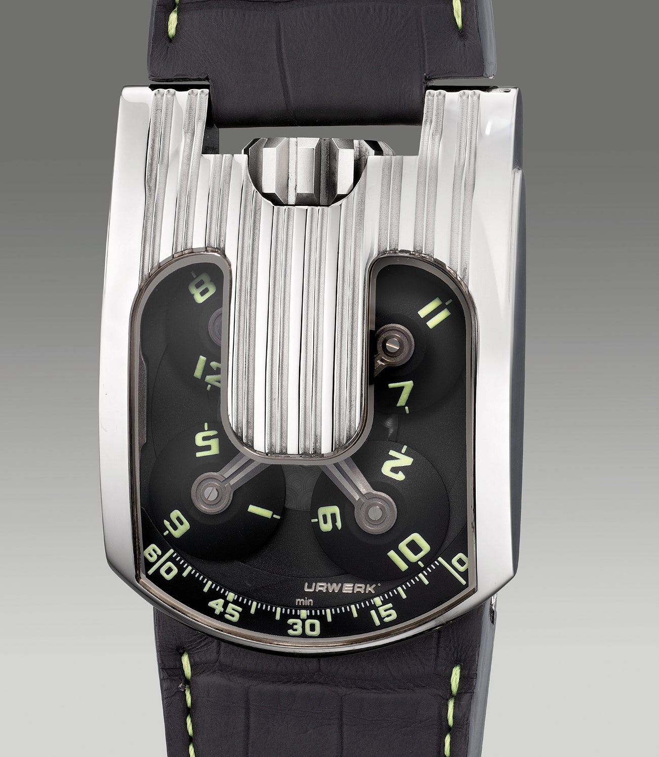 The UR-103 was in production until 2010 and was made in a range of metals and styles, the present example sculpted in white gold is preserved in an attractive futuristic appeal with its sinuous form. Designed with coherent details throughout, the bright green glow of luminous material against the matte black dial enables maximum legibility, furthermore paired with a black crocodile strap with matching green stitch, the watch hugs the wearer’s wrist with extreme comfort and style. More than a horological sculpture, the UR-103 is an icon of 21st century watchmaking and a must have in a collection of independent creators.