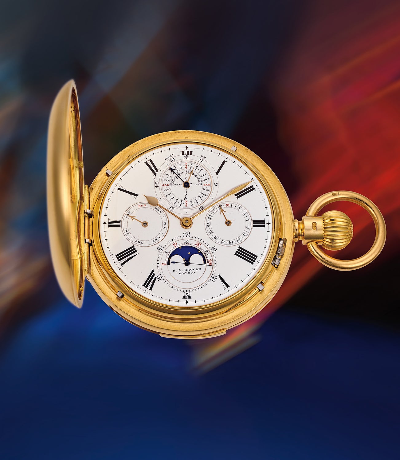 A very fine, extremely rare, and impressive yellow gold minute repeating perpetual calendar hunter-cased pocket watch with moon phase, power reserve, and leap year indication, with champlevé enamel coat of arms and monogram