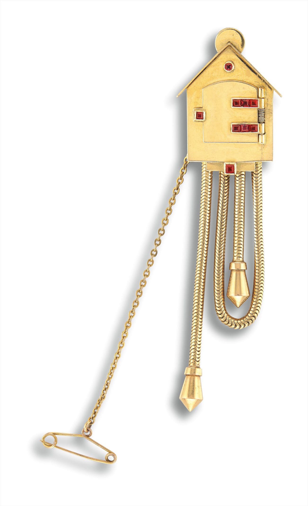 A Retro Ruby and Diamond 'Birdhouse' Lapel Watch, Uti Paris, Circa 1945