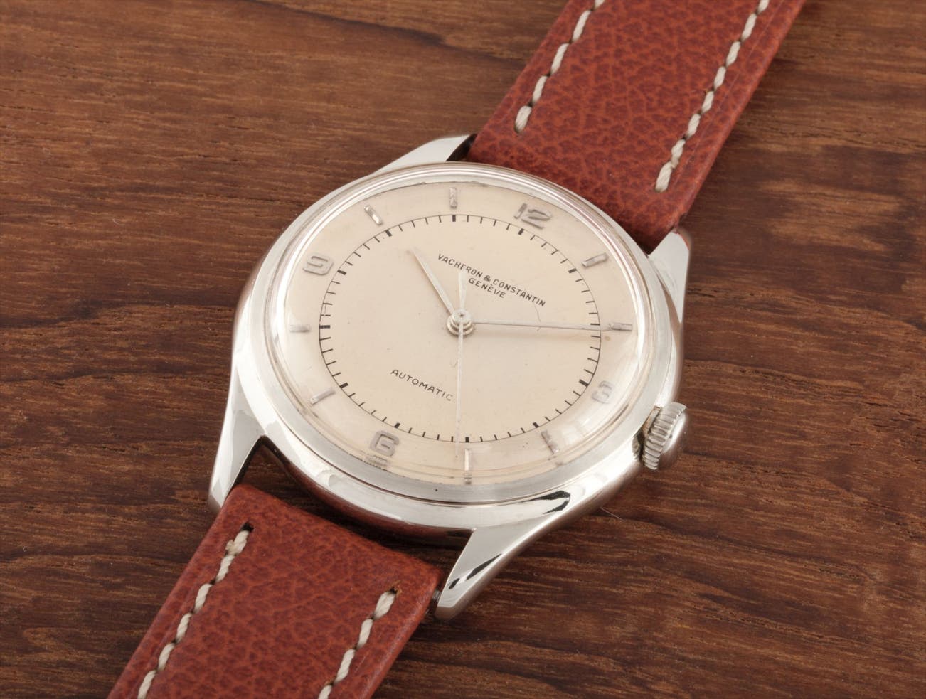 Vacheron Constantin’s first automatic wristwatch used calibre V477 with the typical bumper rotor. Reference 4465 is an excellent representative of this family and is known to have been made in yellow gold and pink gold. Examples like the present one, cased in white gold, are exceedingly rare. Thanks to its solid case proportions and generous diameter of over 35 mm it is a watch that can be worn easily on a daily basis. The present watch features an attractive two-tone dial that, in our view, has never been restored.