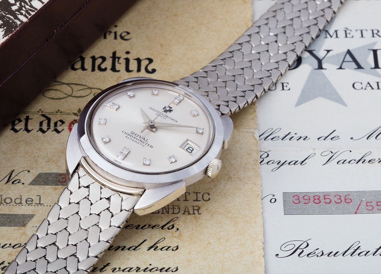 Uncommonly seen with diamond hour markers, the silvered dial features a subtle sun-ray pattern with a diamond-set Maltese Cross at 12 o’clock. This highly desirable watch is presented with its original Vacheron Constantin guarantee and with a rarely seen original Vacheron Constantin chronometer rating certificate.