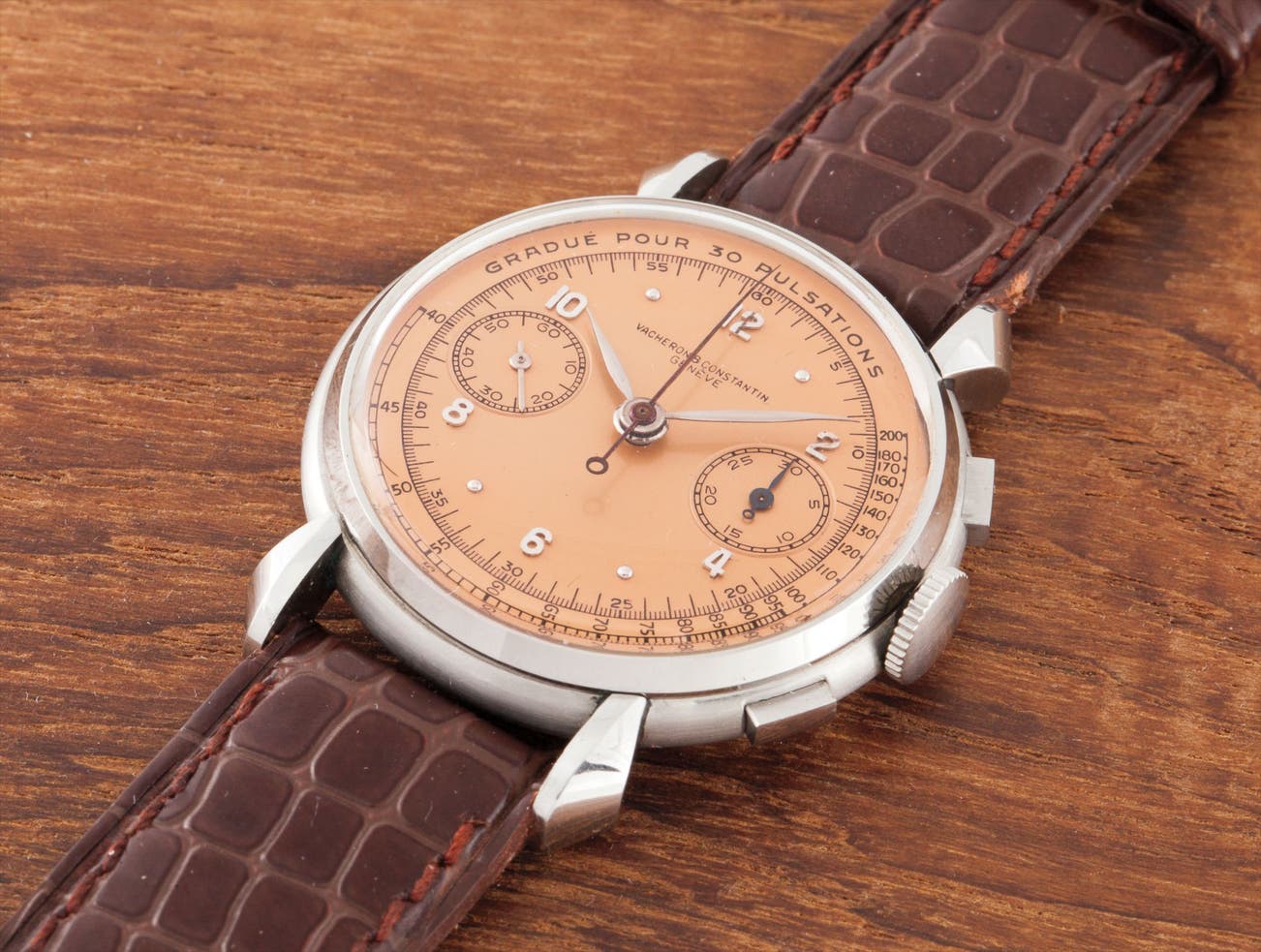 The Vacheron Constantin chronograph reference 4178 is an incredibly good looking watch and hugely undervalued today. Arguably the one style which every collector recalls when thinking of a Vacheron chronograph. Production started in 1940 and continued until approximately 1964. The reference was made in yellow gold, pink gold, stainless steel and steel and gold. The watch is distinguished by its teardrop lugs, sharp lines and definition to the case. The present watch is an exceedingly rare example of a reference 4178 in fabulous condition. Fitted with a salmon dial but with the addition of the popular pulsation scale, the dial is incredibly well preserved with hard enamel signature intact and nicely raised as the connoisseur would require. With the combination of a stainless steel case, still remaining in extremely sharp excellent overall condition with elegant teardrop lugs and a highly unusual and charismatic dial in wonderful original condition, the present watch is one of the rarest and most desirable chronographs manufactured by Vacheron Constantin.