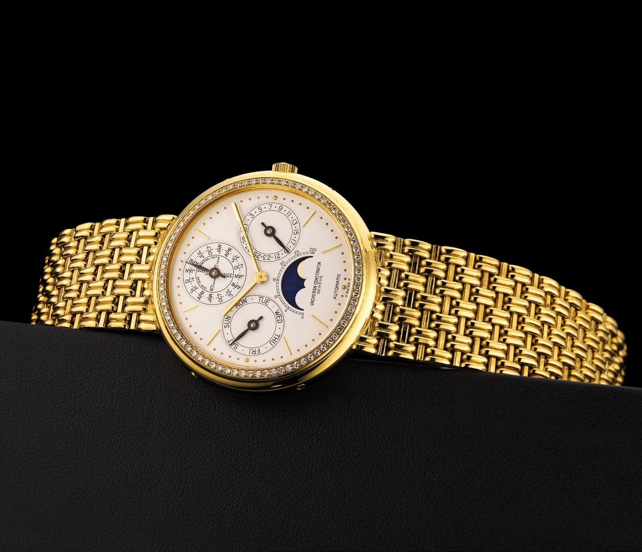 A fine and rare yellow gold and diamond set perpetual calendar bracelet watch with leap year indicator and moon phases