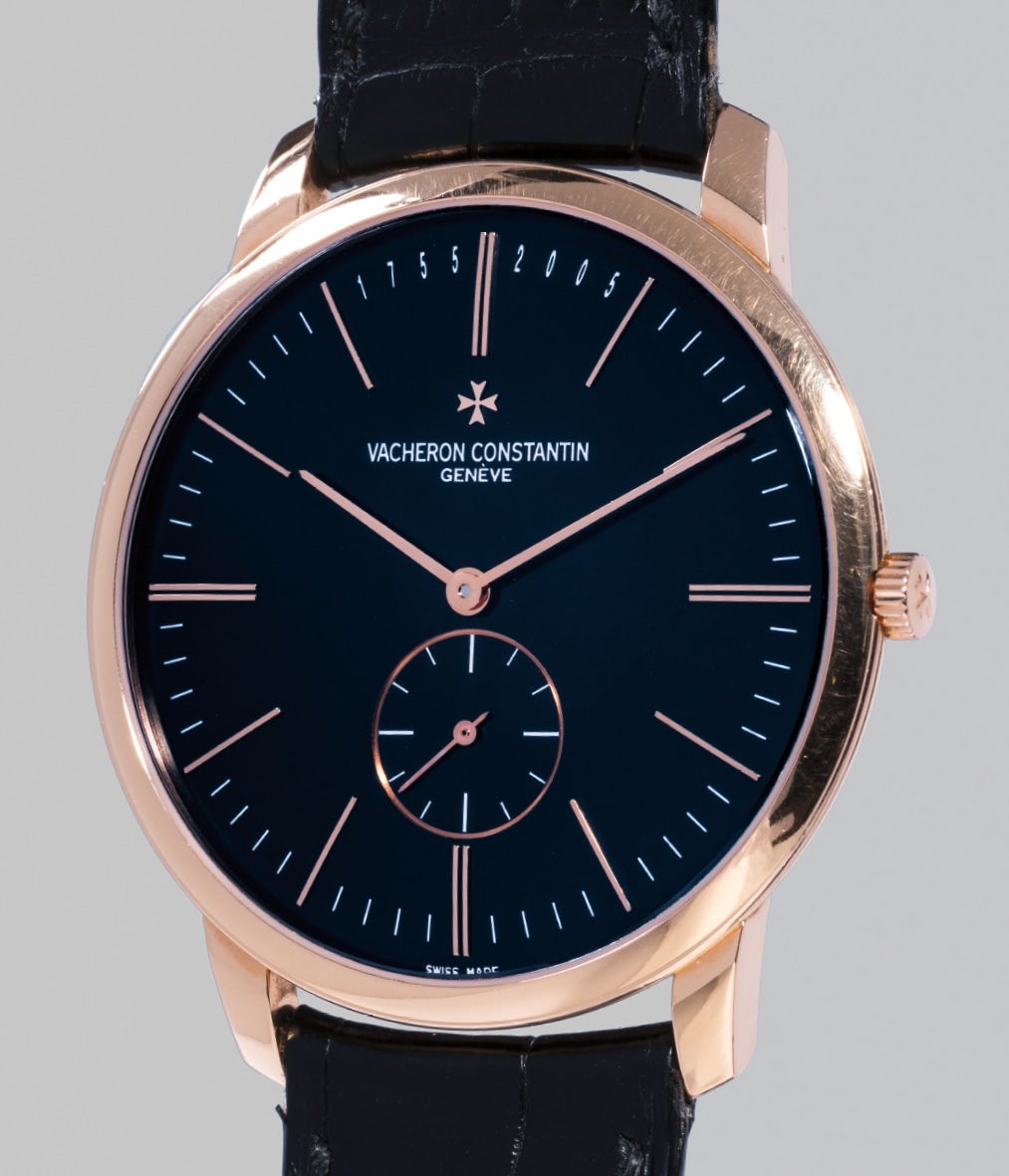 Fitted in a generous yet slim 40mm pink gold case, a manual caliber 1017 powers this confidential watch. The immaculate black dial is adorned with extra slim pink gold applied baton indexes, the minutes are printed in white with an exception between 11 and 1 o’clock where the minute track is subtly replaced by the commemoration date 1775 and 2005.