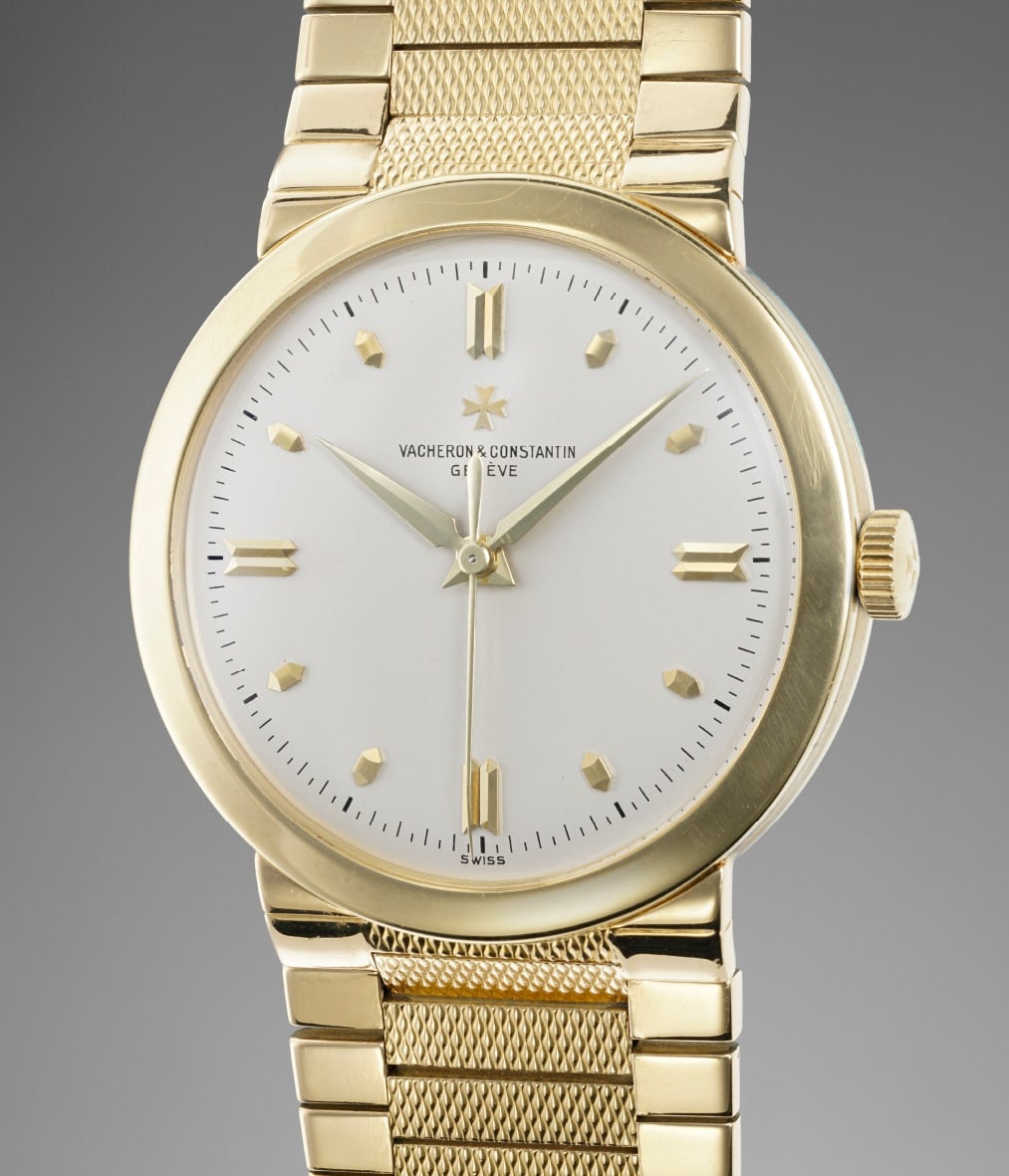The present lot is a fantastic example of Vacheron Constantin’s design acumen, with its large case, beautifully intricate integrated yellow gold bracelet made by Gay Frères and beautiful silver dial with applied and faceted gold hour markers.