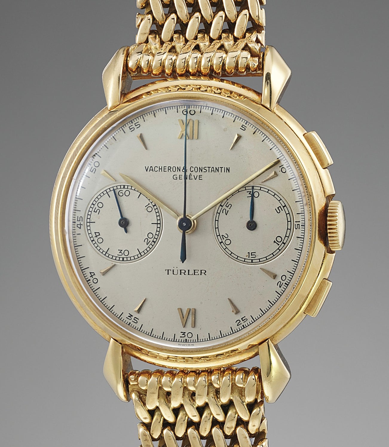 This is why the present reference 4178, with the Türler signature, is such a rare piece. The rarity and appeal of this gorgeous chronograph are further enhanced by the original Gay Frères gold bracelet, stamped 4.52 corresponding to the date of manufacture of the watch, as well as the presence of its original box and papers from Türler confirming the sale of the watch with gold bracelet.