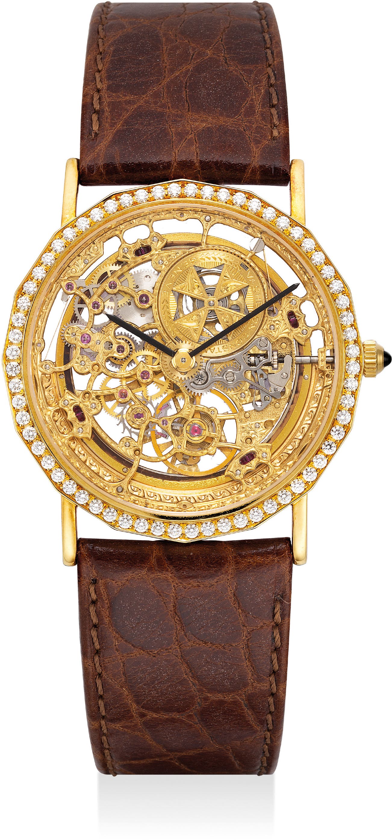 The present example is an attractive 18K yellow gold skeletonized Vacheron Constantin wristwatch fitted with a diamond bezel.
