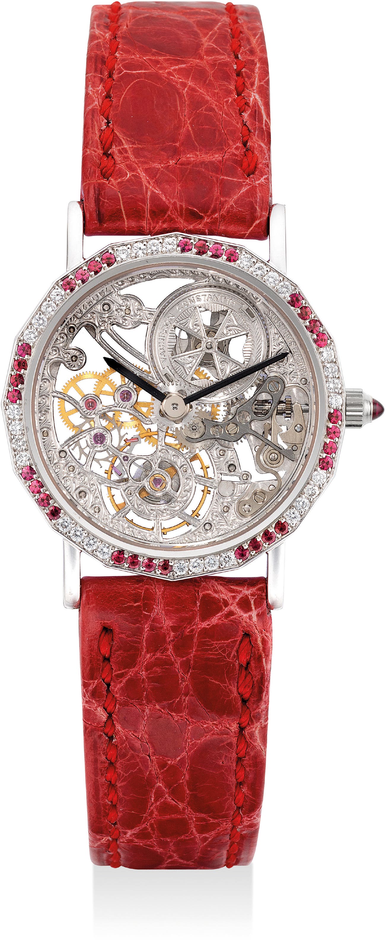 A lady’s fine and attractive white gold, diamond and ruby-set skeletonized wristwatch