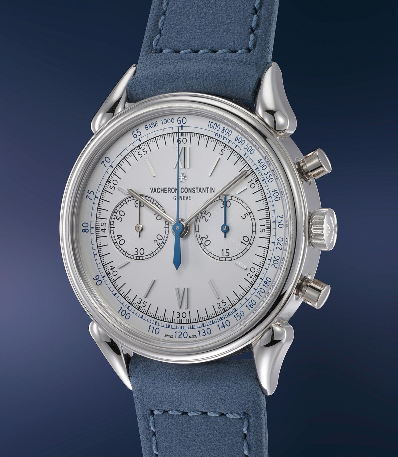 The present "1955 Cornes de Vache", offered in virtually unworn condition and complete of its original accessories, is a reinterpretation of the 1955 reference 6087, which features the fancy lugs which have over time embedded themselves in the minds of collector when it comes to vintage Vacheron Constantin chronographs.