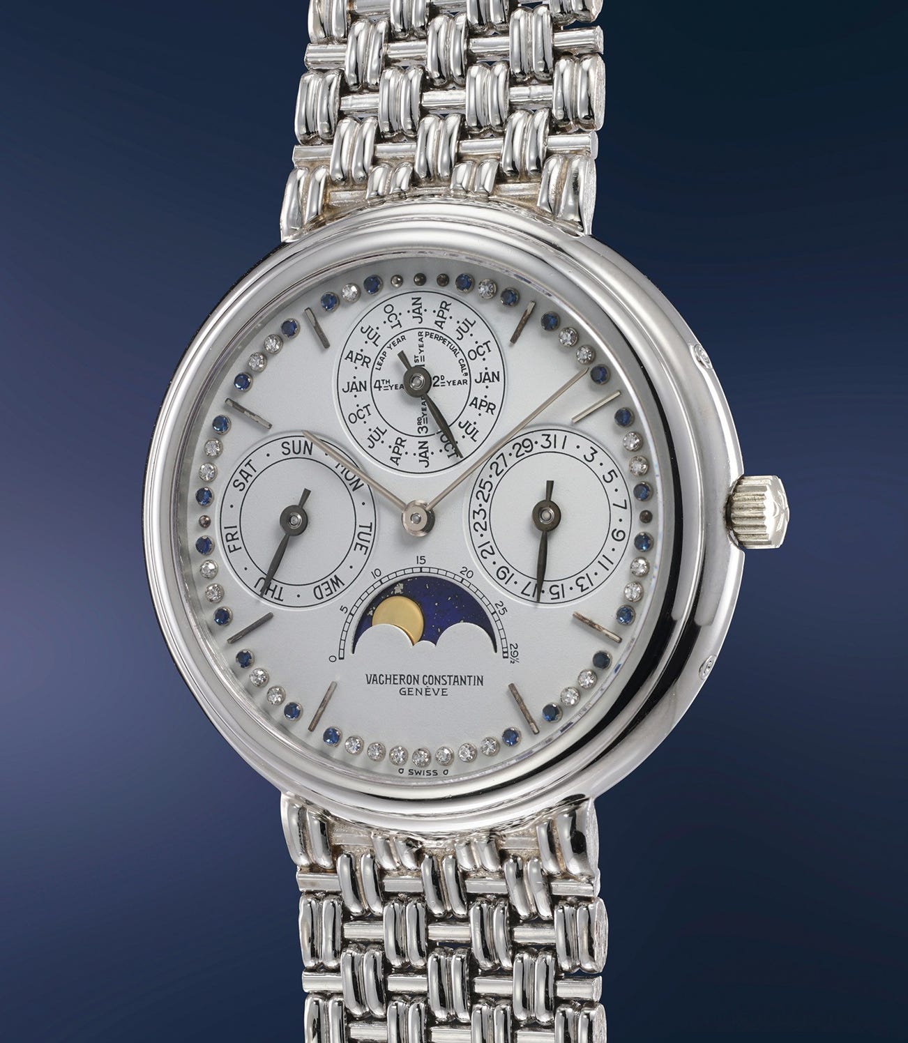 An incredibly rare and attractive platinum perpetual calendar wristwatch with lapis lazuli moonphase with diamond and sapphire set dial, less than 5 known