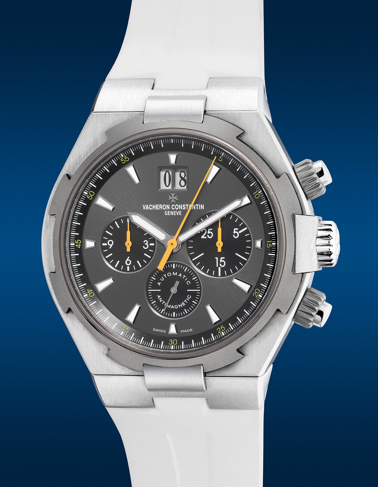 The present Vacheron Constantin Overseas Chronograph ref. 49150 belongs to a handsome and slick iteration that was released as a limited edition of 340 pieces in total in 2015. It features a stainless steel case with an engraved caseback and a sandblasted titanium bezel. Paired tastefully with a sunburst gunmetal grey dial with black registers and vibrant yellow chronographic hands, not only does it exude a sporty appeal, but it also enhances the legibility of the dial. Preserved in attractive overall condition and complete with its full set of accessories along with two additional straps to cater towards the occasions, this wonderful Overseas Chronograph is a perfect choice to start the summer.