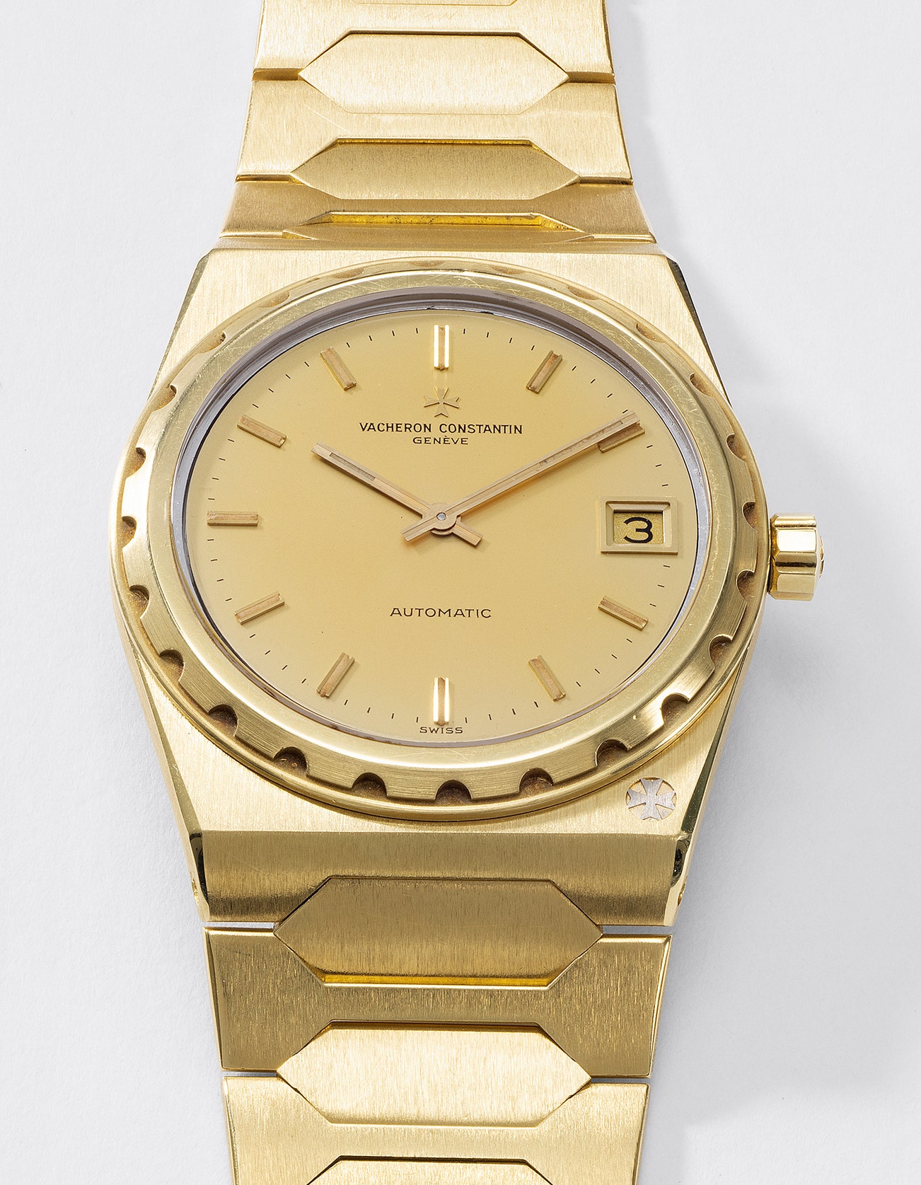 Its tonneau case is made of a single piece that is opened by a screwed-in porthole type fluted bezel, and is water resistant to 120 meters. Only the 222 came with an integrated bracelet made of the same metal as the case. The ultra-thin, self-winding cal. 1121 housed within the 222 is Vacheron Constantin's answer to the famed Jaeger-LeCoultre cal. 920 seen in the Patek Philippe Nautilus and Audemars Piguet Royal Oak. The 222's design is distinguished from its premium sports watch competitors of the era by the scalloped bezel and hexagonal flat links of the bracelet, as well as the little Maltese cross inserted on the case.