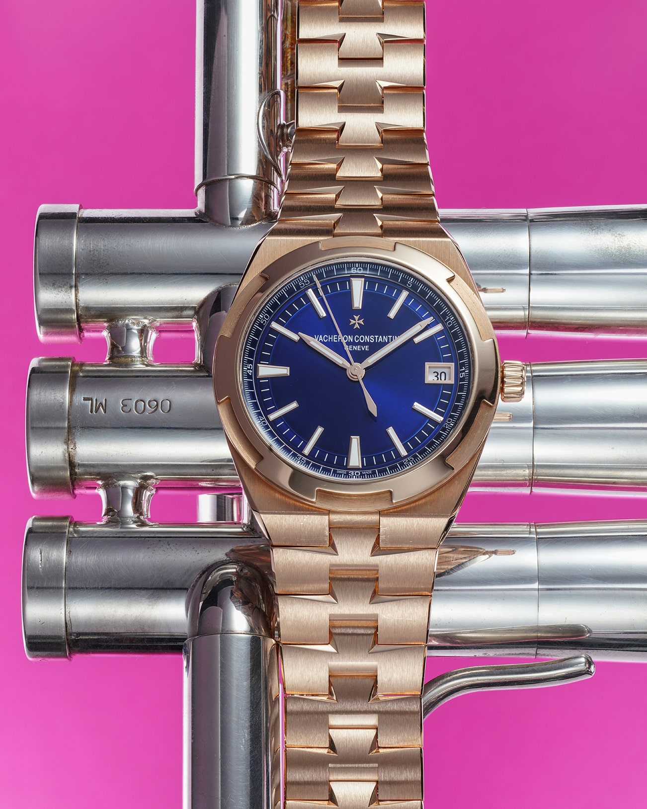- A perfect daily companion, the present Overseas reference 4500R (sized at 41mm) is equipped with a flamboyant pink gold bracelet that is easily interchangeable by its wearer to a rich blue rubber or alligator strap that wraps around the wrist with equal comfort.