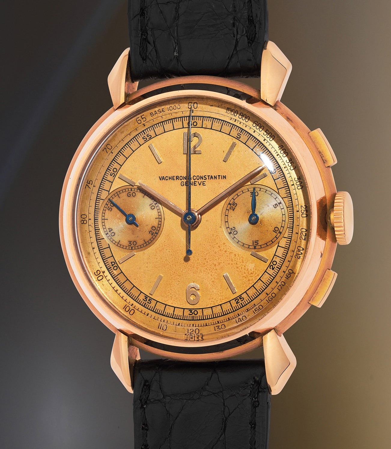 The present watch is highlighted by a vibrant and harmonious two-tone champagne dial with aging and patina creating a warm appeal. The case is well proportioned with faceted lugs and sensual curves that collectors find so attractive.