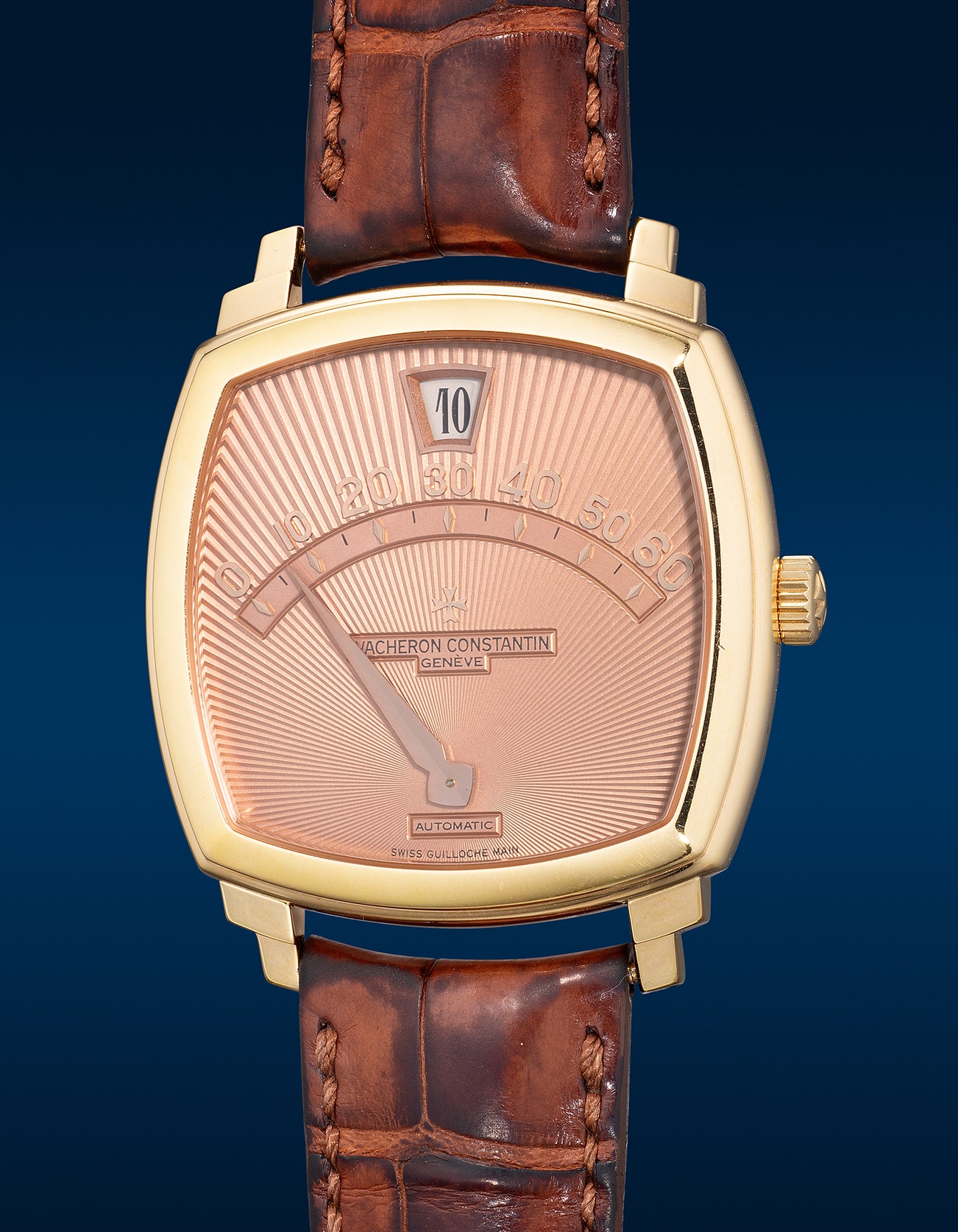 - Framed by its elegant pink gold cushion-shaped case, the rich salmon dial is finished with a hand guilloché that fans out to complement the retrograde minutes with highly legible numerals alternating between sizes.
