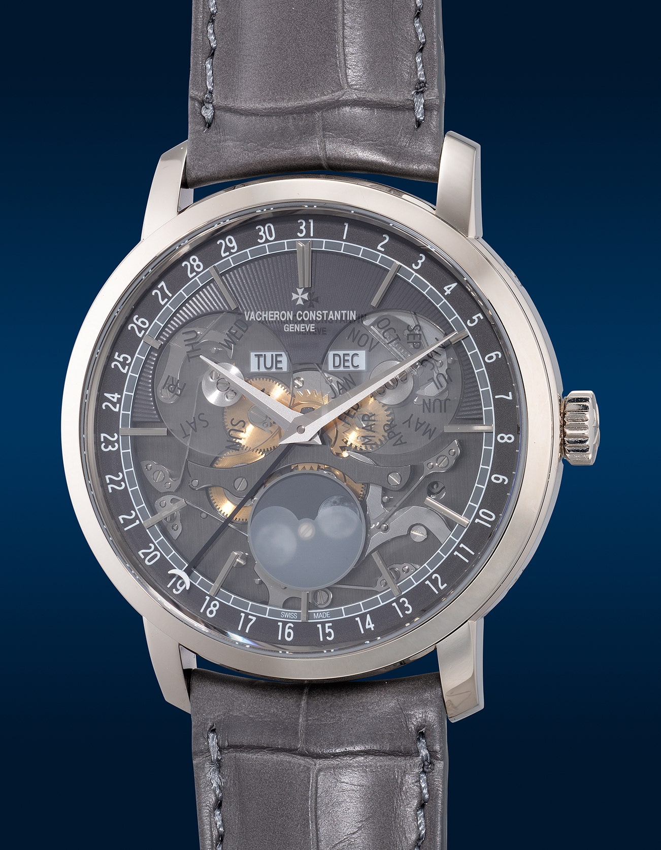 - With an anthracite finish on the plate and bridges of the movement, it is the final piece of the puzzle to form a truly remarkable masterpiece that is both strikingly handsome and highly practical. Presented in virtually brand new condition, this timepiece not only holds considerable collectible value but also pays homage to Vacheron Constantin's rich history in watchmaking.