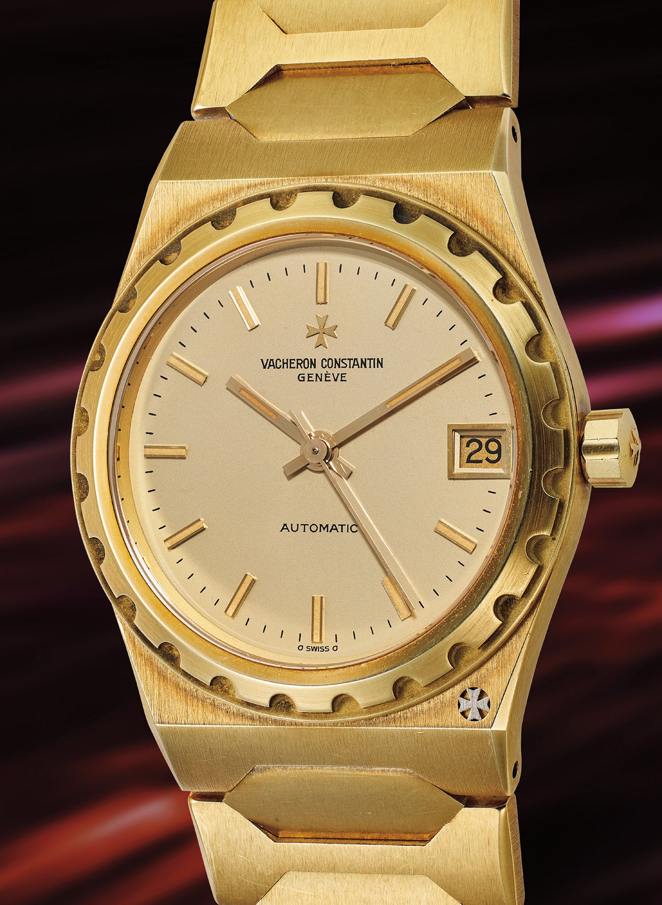 The present watch, from 1983, is extremely well preserved in excellent overall condition with strong case proportions and sharp edges. Showing hardly any signs of wear and with an extremely taut bracelet, the case back’s engraved “222” and serial numbers are crisp. In luxurious, solid 18 karat yellow gold, Vacheron Constantin’s 222 is an iconic luxury timepiece, certain to delight all collectors.