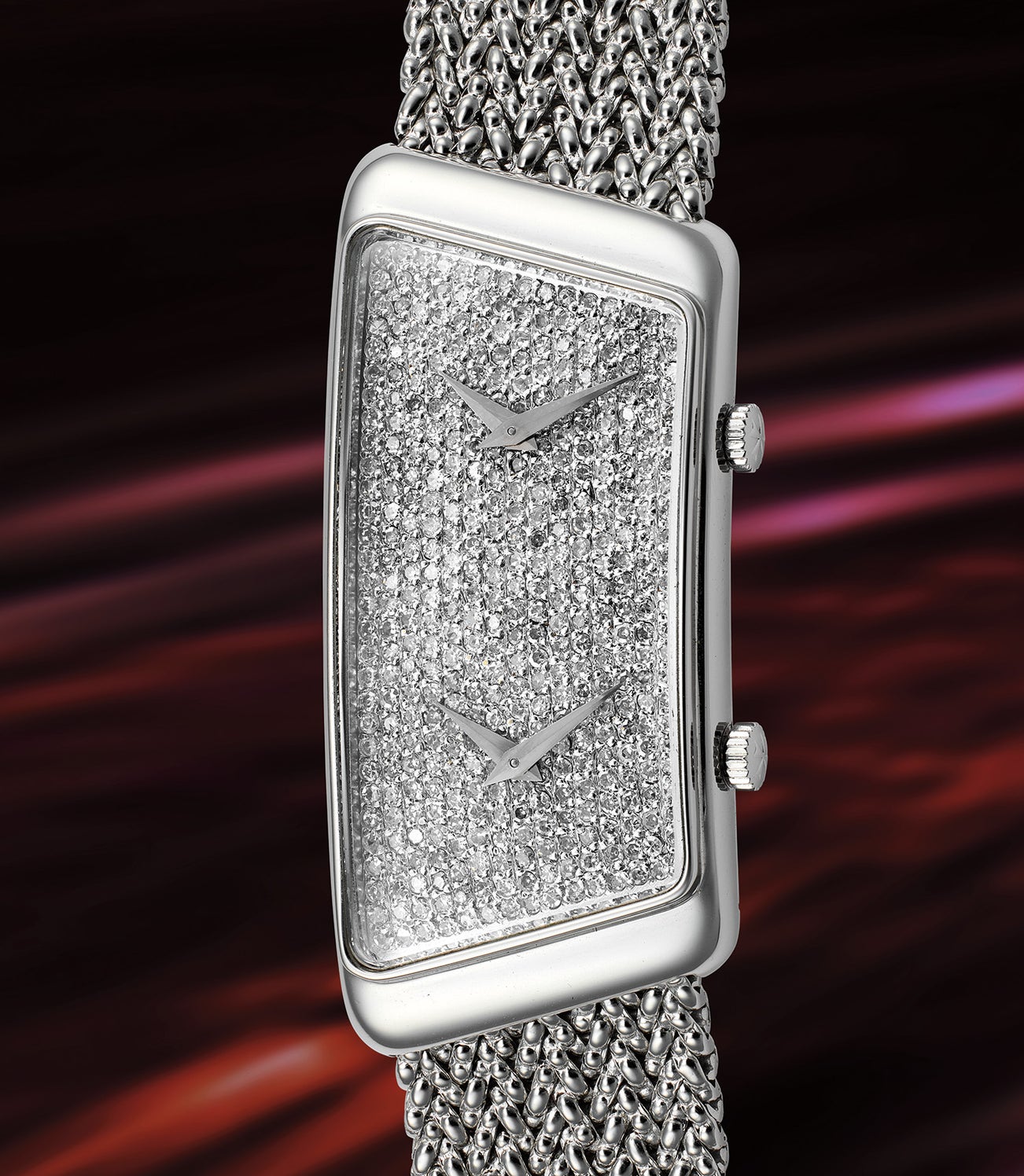 The present lot is a flamboyant and rare example of the original Prestige de France models dating from the 1970s with a rare dual time function, fitted with two individual, high-grade movements. With a stunning, pave-set diamond dial, it's completed by a superb, pebble-texture white gold woven bracelet in absolutely pristine condition.