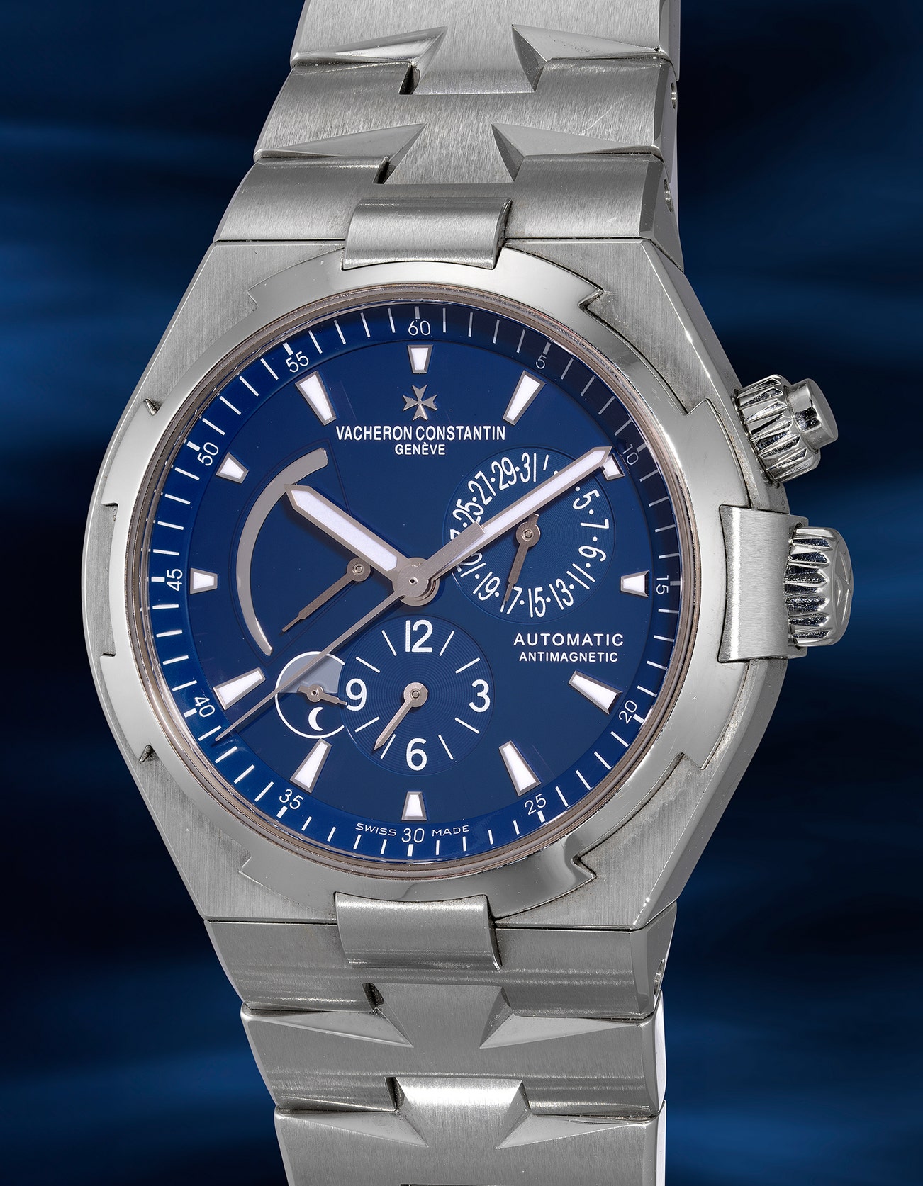 - Sporting a masculine rich navy blue dial, the dual-time sports watch is muscled up to a 42mm diameter and is equipped with not only functionality but flawless legibility. Its caseback is decorated with the Overseas ship engraving.
