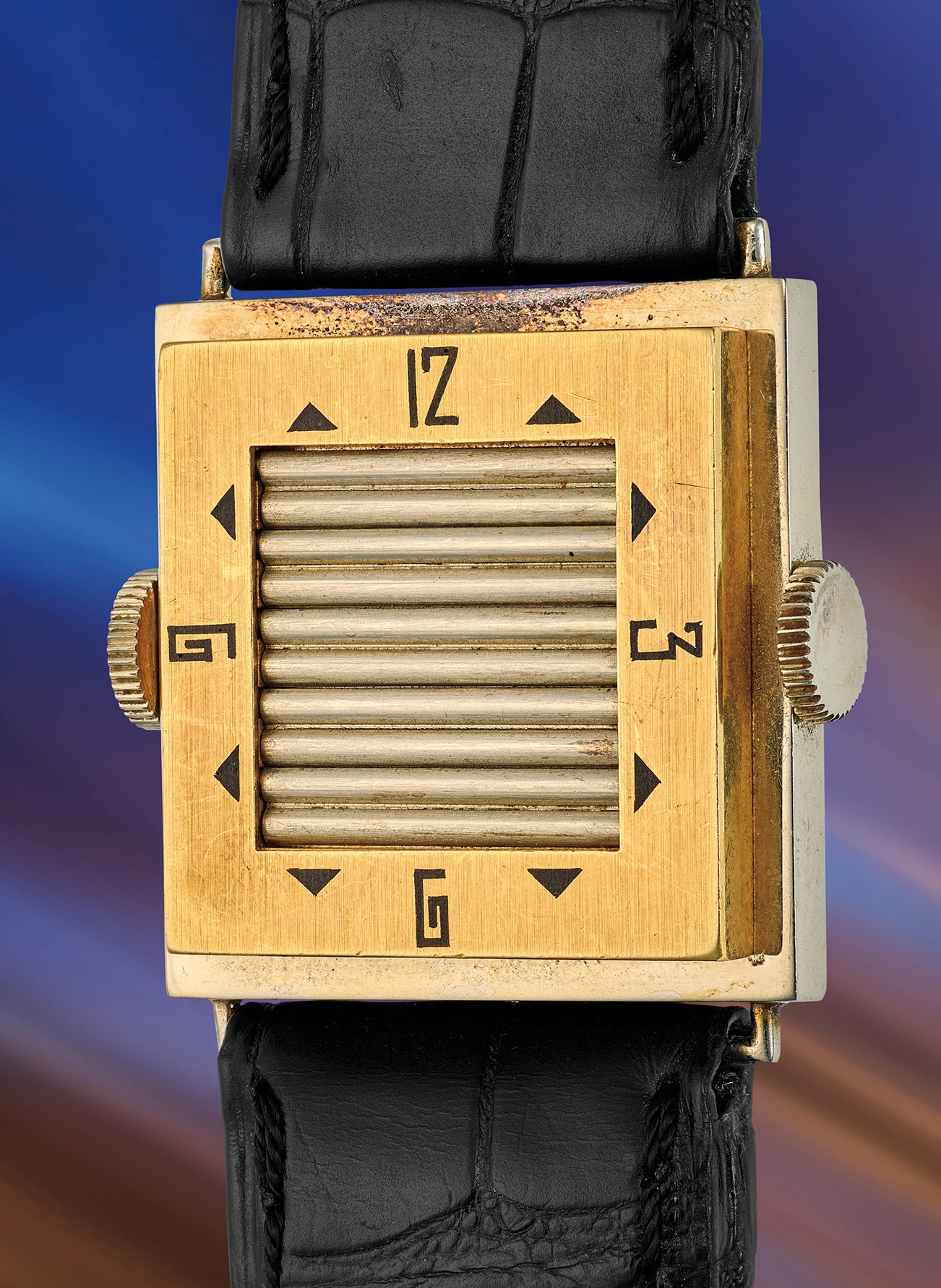 With its narrow slats opening like Venetian blinds, the ingenious mechanism formed a protective shield for the fragile crystal and precious dial. The present watch is a very rare example of a version with horizontally oriented shutters. The shutters open flawlessly by turning the crown at 3 o’clock. There is a crown at 9 o’clock for winding and setting of the movement. Featuring a yellow gold bezel atop a white gold, perfectly square case, this rare Verger Frères watch made for Vacheron Constantin would add a charismatic and distinctive Art Deco touch to any collection.