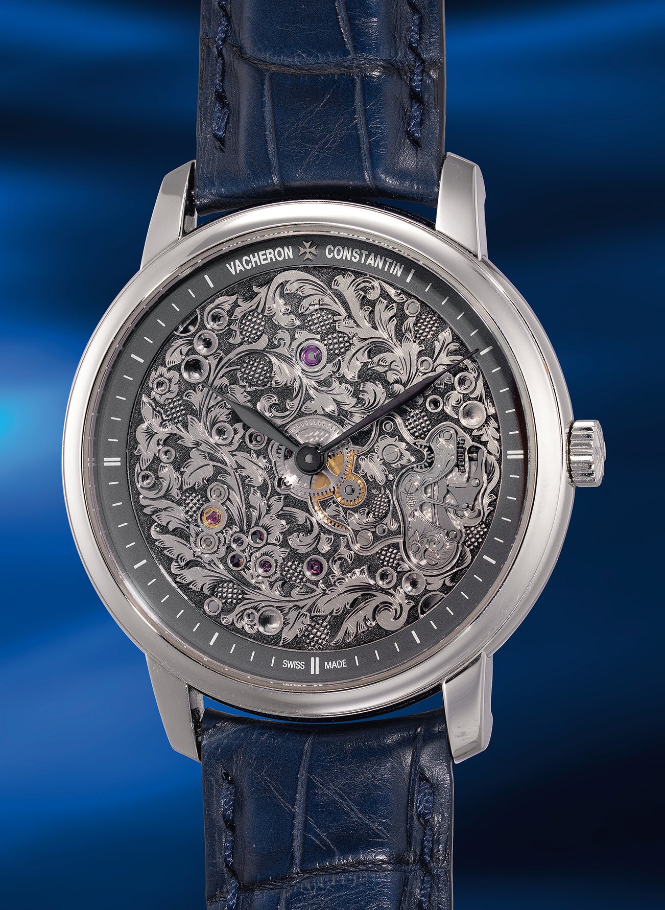 The present time-only reference houses the manual wind cal. 4400 within a 39mm diameter platinum case. A grey minute track frames the ornate backdrop, with equally resplendent acanthus leaves adorning the movement, inviting admiration of the freehand engraving through the sapphire crystal. By enveloping the dial and movement in unified engraved decoration, Vacheron Constantin creates an artistic wonder.