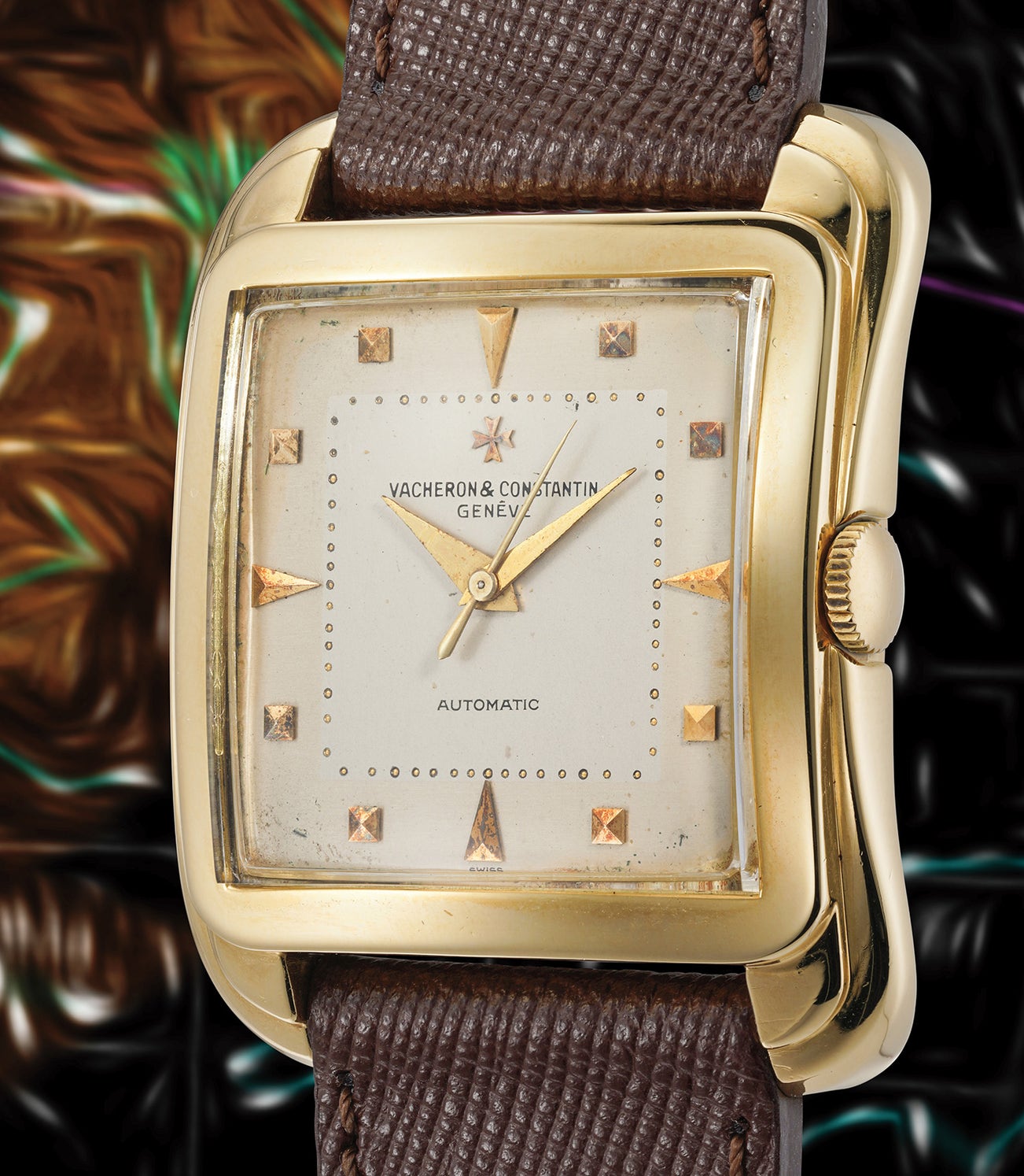 The present example is distinguished by a very well-preserved case, which allows the beholder to fully enjoy the voluptuously sculpted shapes of the model. This particular configuration, with center seconds and no date, is appreciated by traditionalists and non-conformists for its elegant simplicity and the purity of its design. The golden age of wristwatches is defined by many iconic timepieces, and the “Cioccolatone” is an unconventional watch showcasing the creative exuberance of Vacheron Constantin.