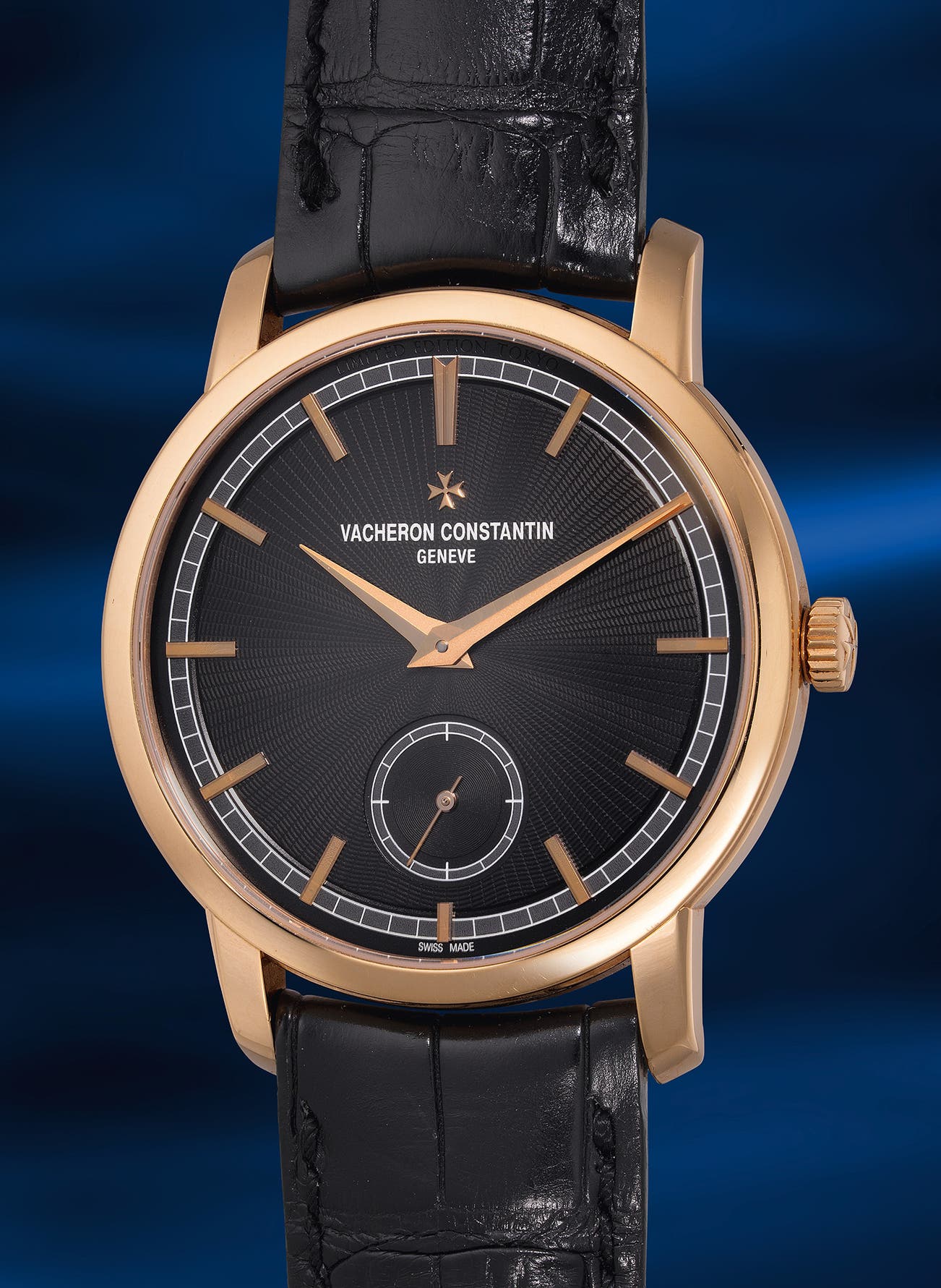 An extremely rare and elegant limited edition pink gold wristwatch with small seconds, guilloché dial, guarantee and presentation box, one of a limited edition of 20 pieces made exclusively for the opening of the Tokyo Ginza boutique