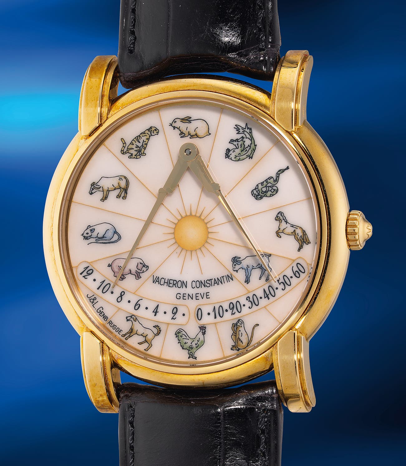 An extremely rare, intricate and well-preserved yellow gold wristwatch with retrograde hours and minutes, polychrome champlevé enamel dial depicting Chinese zodiac, certificate and presentation box