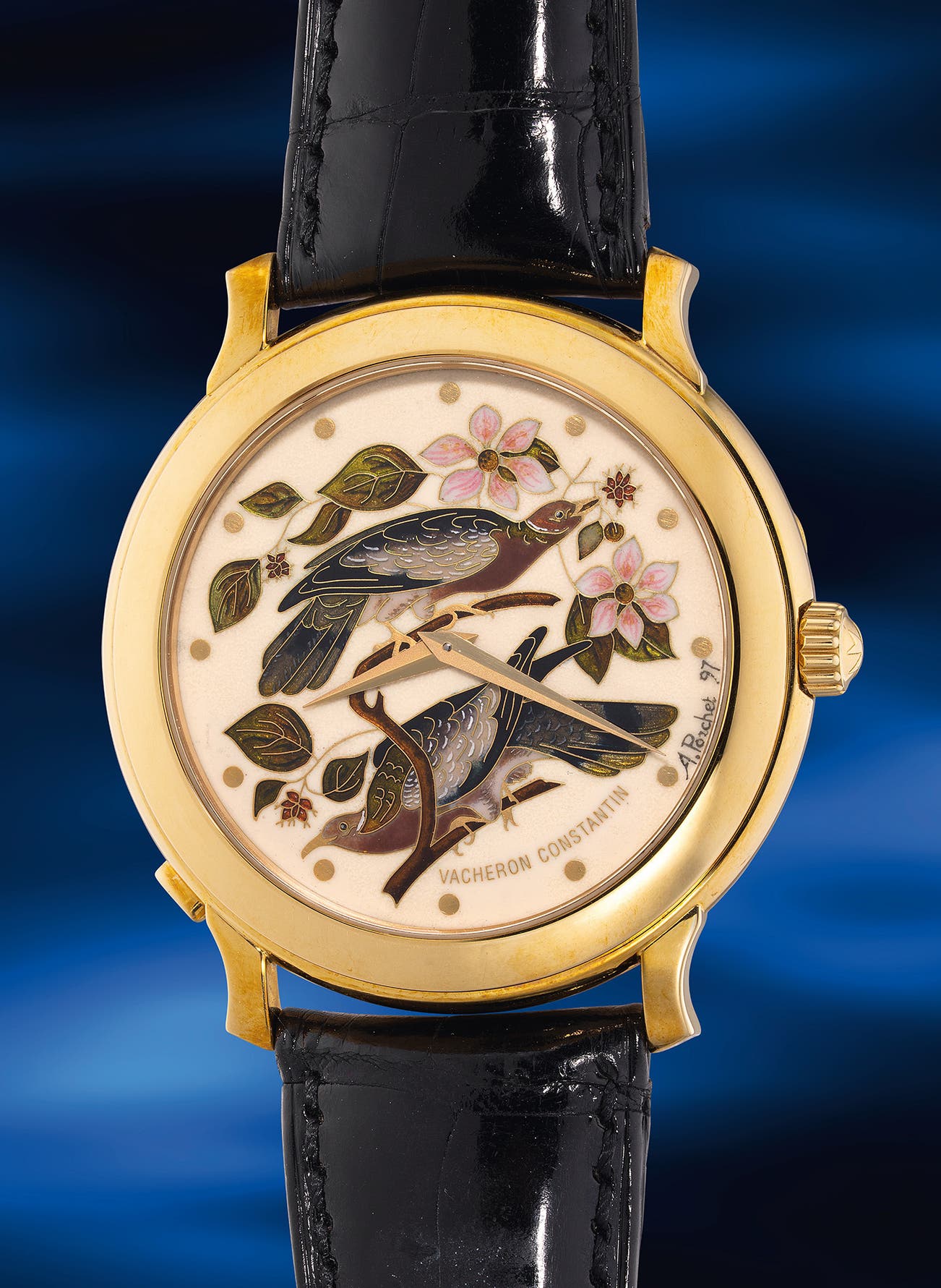A well-preserved, exquisite and attractive limited edition yellow gold wristwatch with cloisonne enamel dial signed by Anita Porchet, warranty and presentation pouch, one of a limited edition of 10 pieces, made as tribute to Jean-Jacques “Audubon’s Birds of America: Band-tailed Pigeon”