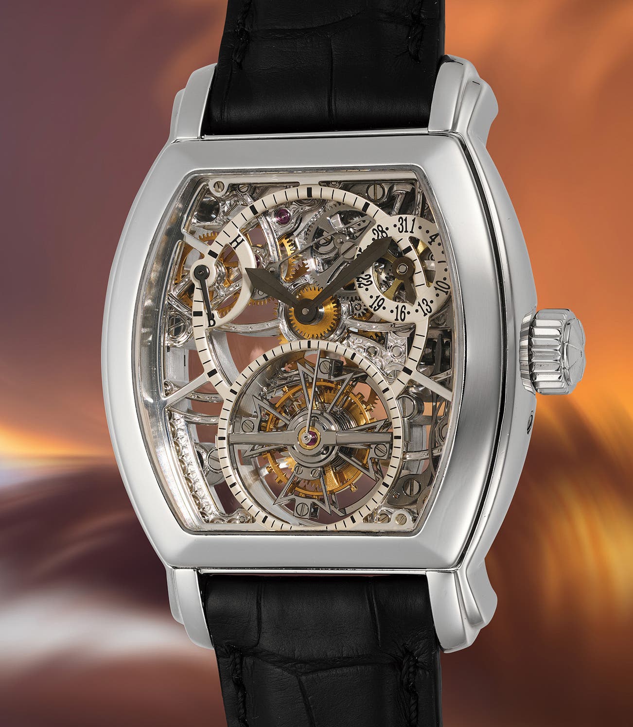 A rare and compelling platinum tonneau-shaped tourbillon wristwatch with skeletonized dial, power reserve, date, blank guarantee card, and box