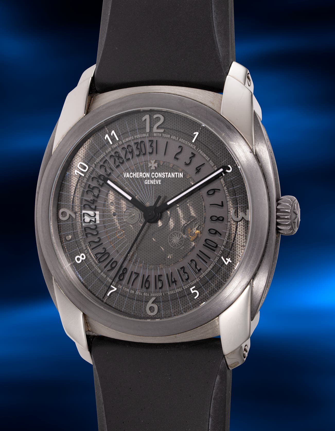 - The sapphire crystal dial is semi-skeletonized, incorporating advanced security printing technologies like secret texts, micro-printing, security inks and UV markings. Under UV light, a hidden sun motif glows on the dial, inspired by the clock tower opposite Vacheron Constantin’s Quai de l'Ile headquarters. The date wheel remains fixed, with a white triangle moving beneath the dial to indicate the date.