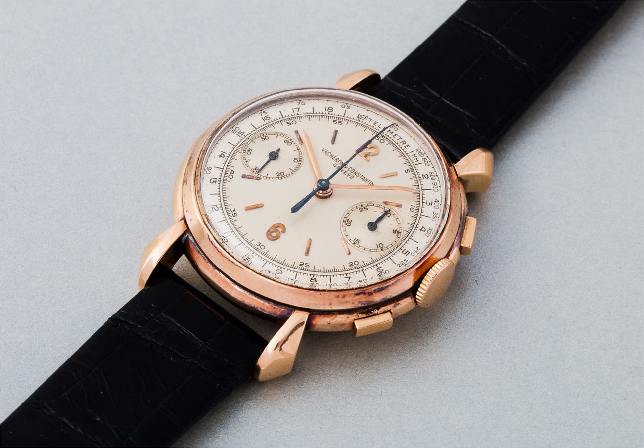 During its production, the reference 4178 housed two different chronograph calibers: V492 and V434. Research shows us that reference 4178 housing the earlier caliber 492 was made in only 108 examples in pink gold. The present watch is in overall excellent condition retaining the faceted lugs and sensual curves that collectors find so attractive. Having developed a wonderful patina, a reference 4178 in this condition is a rare find - and a true treasure for the connoisseur.