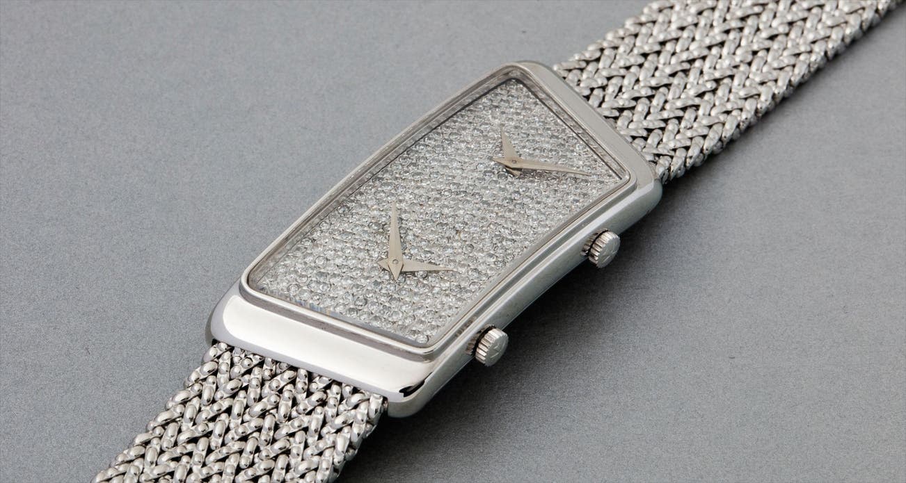 The present lot is a flamboyant and rare example of the original Prestige de France models dating from the 1970s with a rare dual time function, fitted with two individual, high-grade movements. With a stunning, pave-set diamond dial, it's completed by a superb, pebble-texture white gold woven bracelet in absolutely pristine condition.
