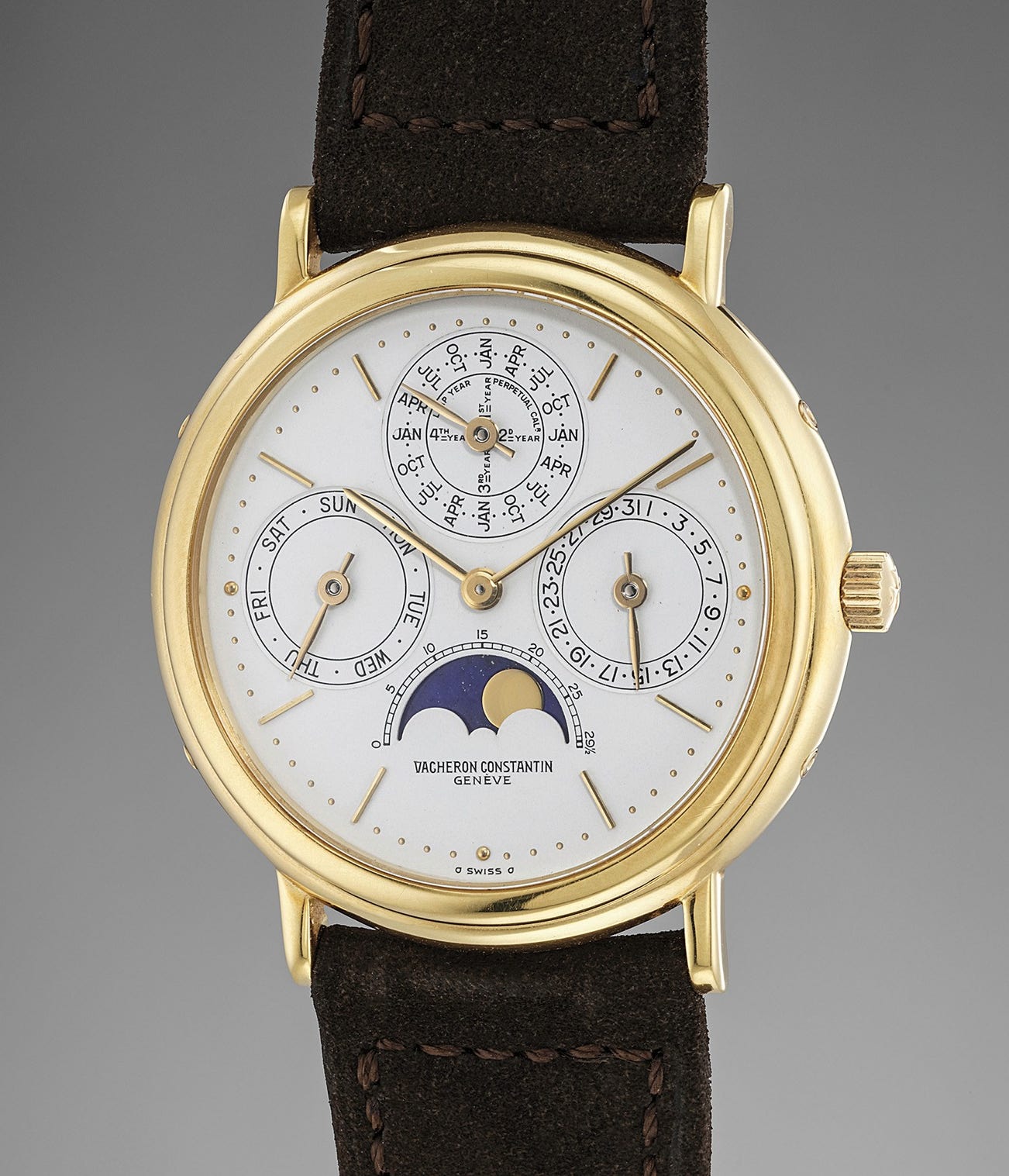 A fine and rare yellow gold perpetual calendar wristwatch with leap year indication