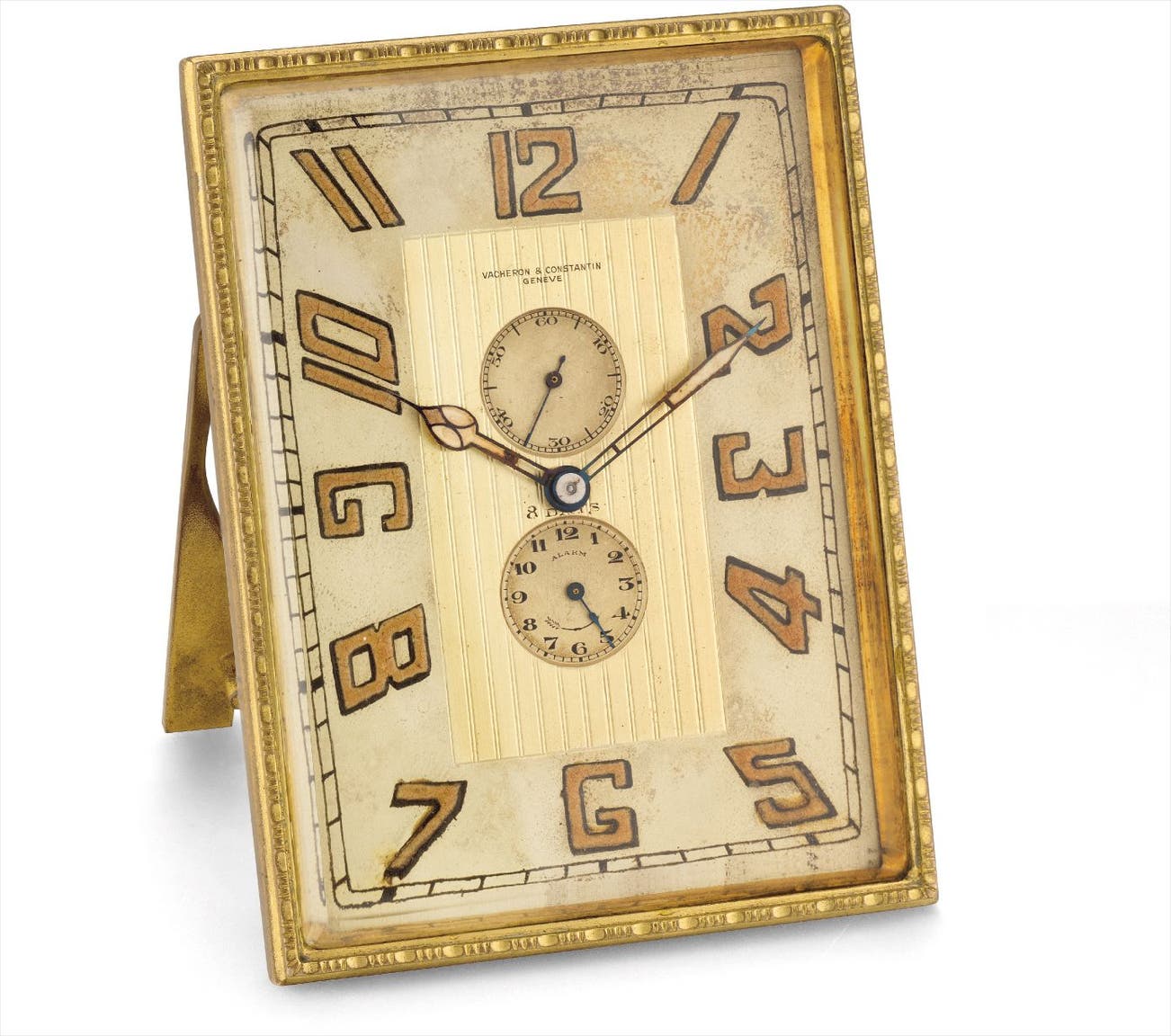 A fine and rare gilt metal eight day desk clock with alarm