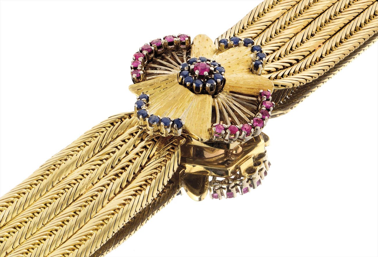 A very rare and unusual three-colour gold, ruby and sapphire-set bracelet watch with concealed dial