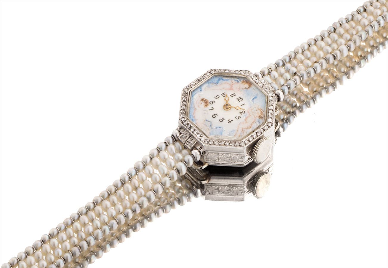 A lady's very rare and unusual platinum, diamond and cultured pearl-set hexagonal bracelet watch with enamel dial