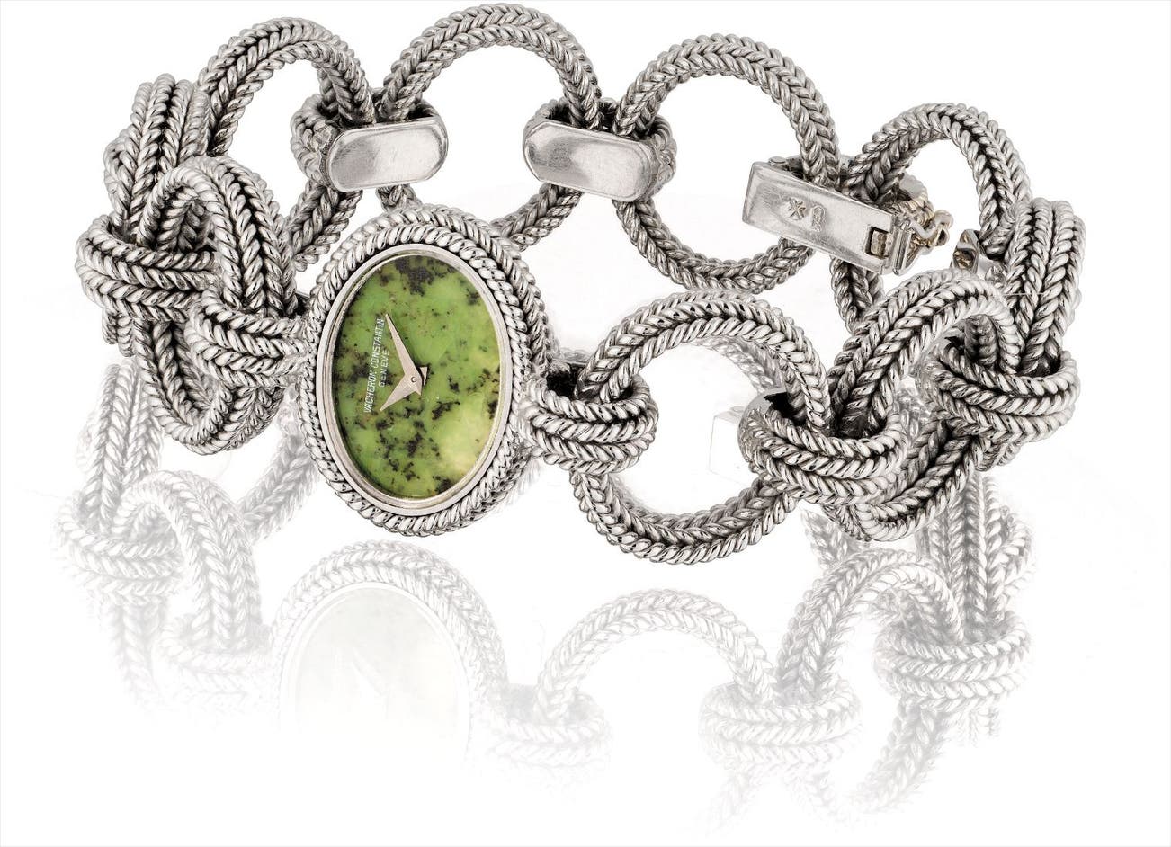 A rare white gold oval rope-twist bracelet watch with malachite hardstone dial