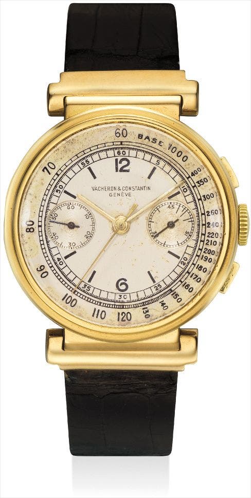 The present yellow gold chronograph with mobile lugs was manufactured in 1937. However, the model only received a reference number in 1938, which means the present watch does not have a reference engraving on the caseback, which is correct for the time period.