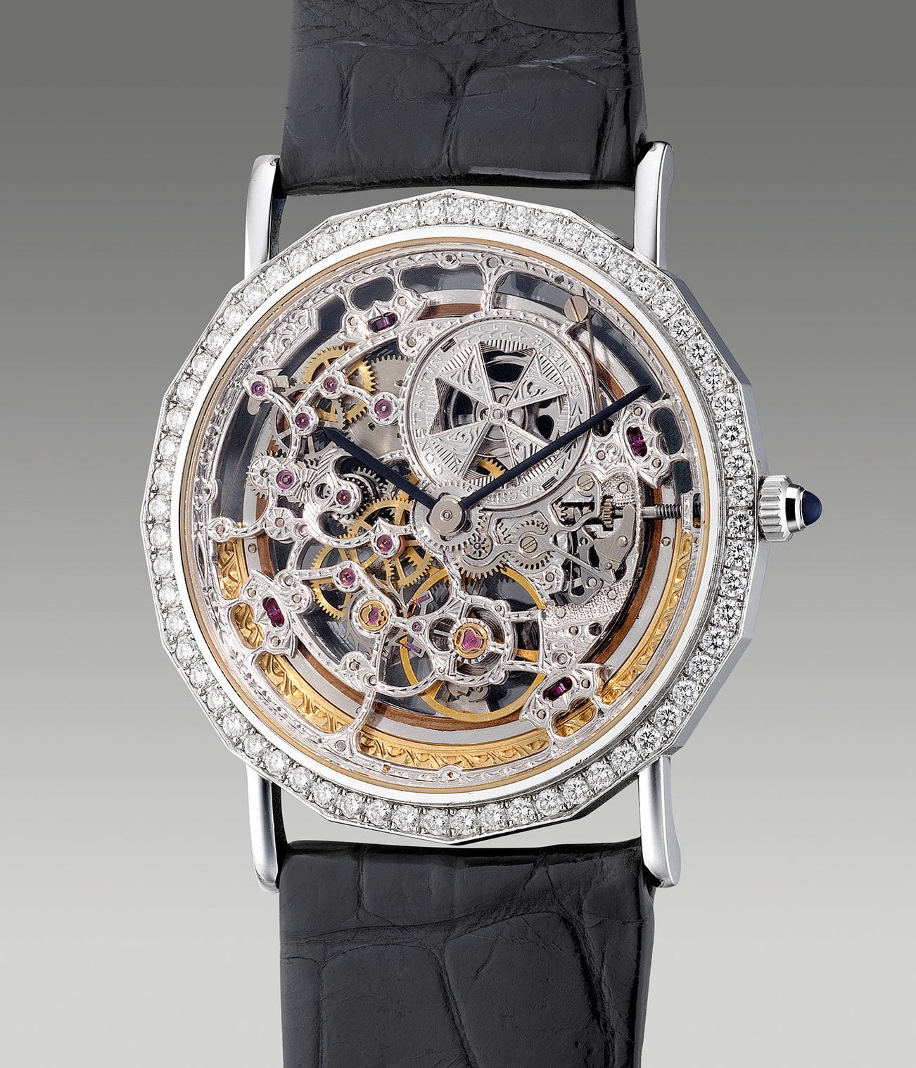 A fine and attractive white gold and diamond-set skeletonized wristwatch with certificate