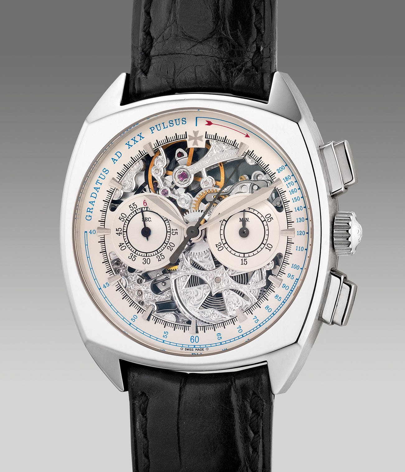 A fine and attractive limited edition platinum skeletonized chronograph wristwatch with pulsation scale, numbered 15 of a limited edition of 30 pieces