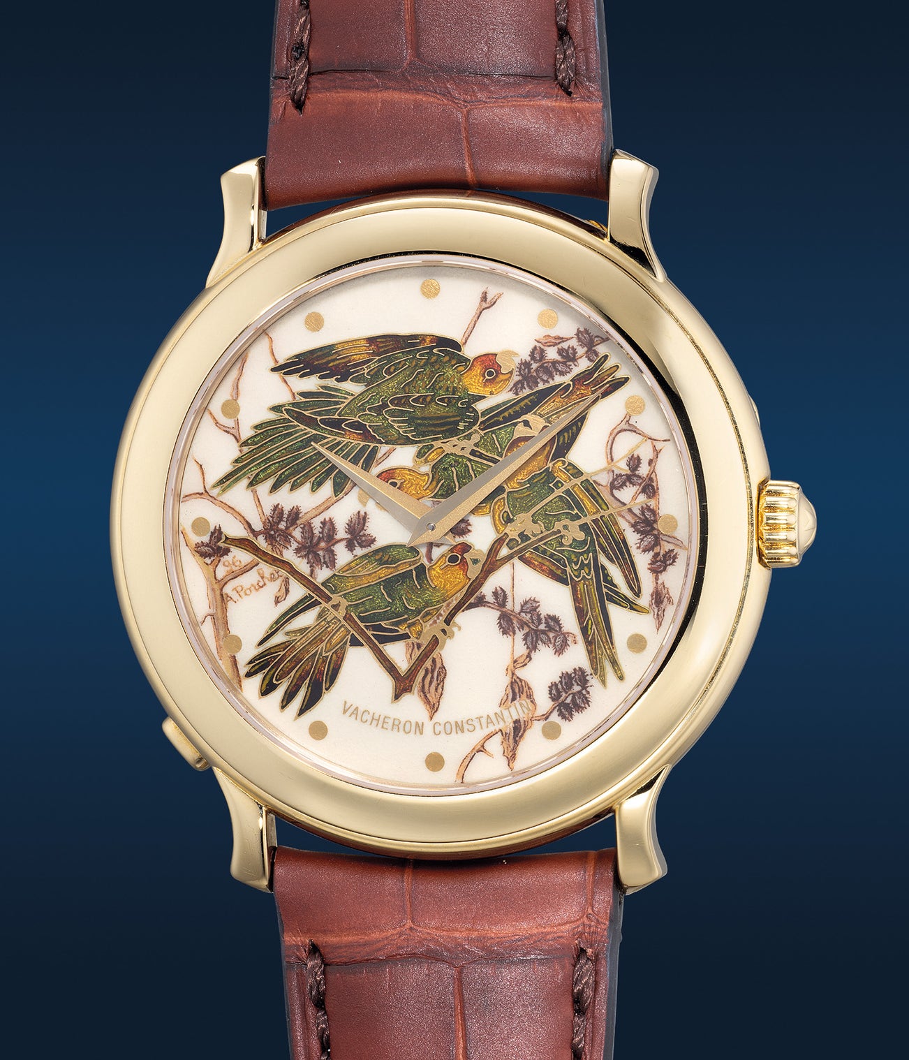 An exquisite and divine limited edition yellow gold wristwatch with champlevé and miniature enamel dial signed by Anita Porchet, and presentation box, made in tribute to Jean-Jacques Audubon’s “Birds of America: La Perruche de Caroline”