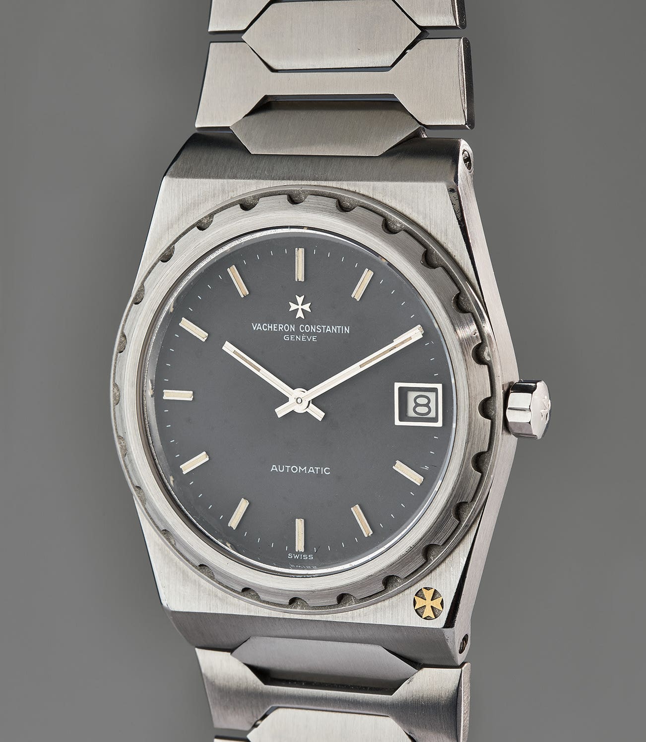 Within the 222 lies the ultra-thin, automatic calibre 1121, Vacheron’s take on the renowned Jaeger LeCoultre calibre 920 used in the Patek Philippe Nautilus and the Audemars Piguet Royal Oak. The scalloped bezel and the hexagonal flat links of the bracelet, as well as the small Maltese cross inset to the case differentiate the design of the 222 from its luxury sports watch competitors of the era. Produced for only seven years, with a total of 500 pieces made in all metal and dial combinations, the 222 commemorated the 222nd anniversary of Vacheron Constantin. Offered here in well-preserved condition and a highly sought after dark gray dial, this oversized luxury sports watch and ancestor of today’s Overseas model is ideal for the collector seeking the uncommon.