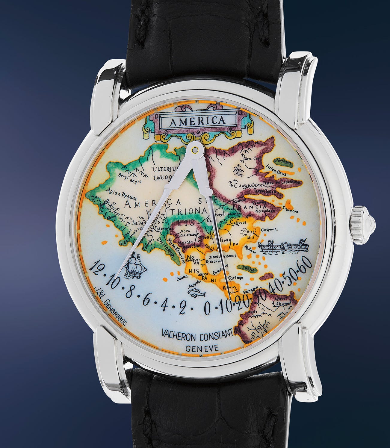Vacheron Constantin’s uniquely designed Mercator wristwatch was released in 1994 for the 400th anniversary of the scholar’s death and pays homage to him through its unique and painstaking design. The retrograde hour and minute indicators resemble the legs of a handheld compass, while the stunning cloisonné enamel dial of the “Americas” is rendered from his map dating to circa 1623. The dial – and indeed, the concept for the watch itself - is the work of Belgian master enamellers Lucie and Jean Genbrugge, who specialize in making ultra-thin miniature paintings on enamel. The dials were made in either yellow or white gold and then filled with enamel. Research shows that fewer fully enameled pieces were made for the western hemisphere than the eastern hemisphere. In 1996, the dial would win “Best Dial” at Baselworld.
