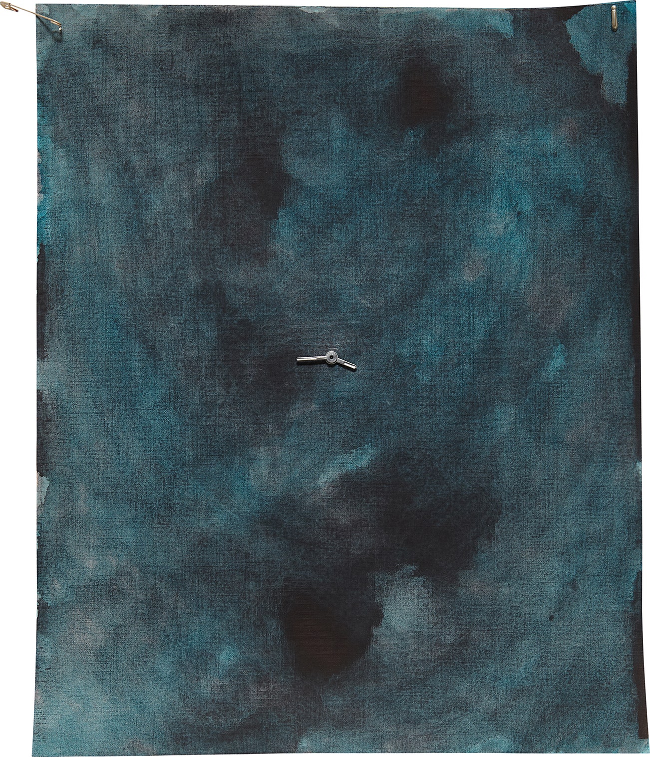 watercolour on paper, clock, safety pin, L-shaped hanging screw, artist's painted wooden box
