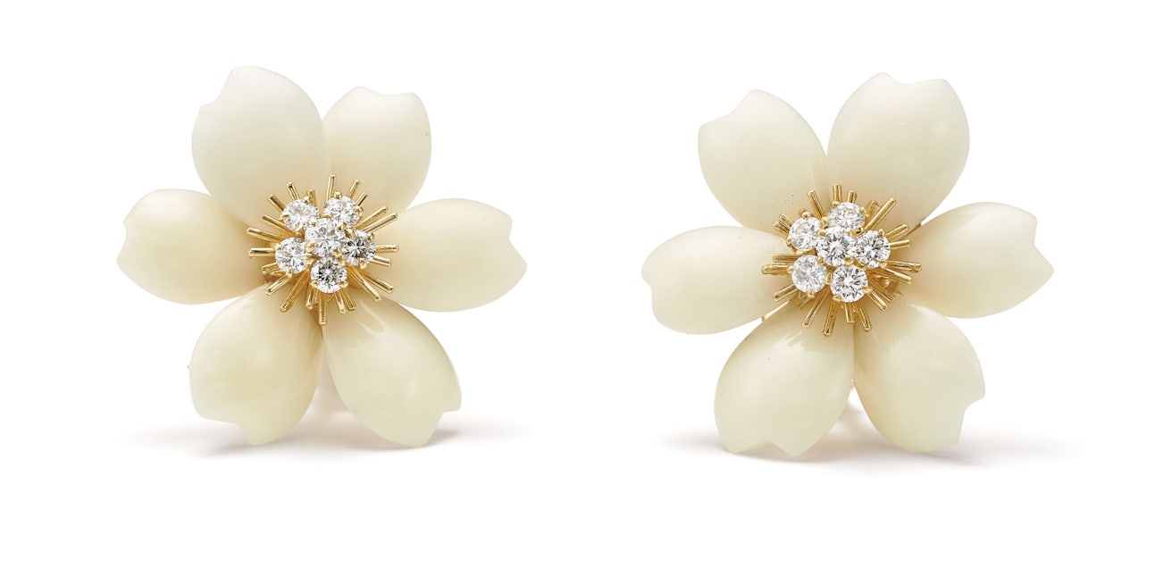 A Pair of Coral, Diamond and Gold ‘Rose de Noël’ Earrings