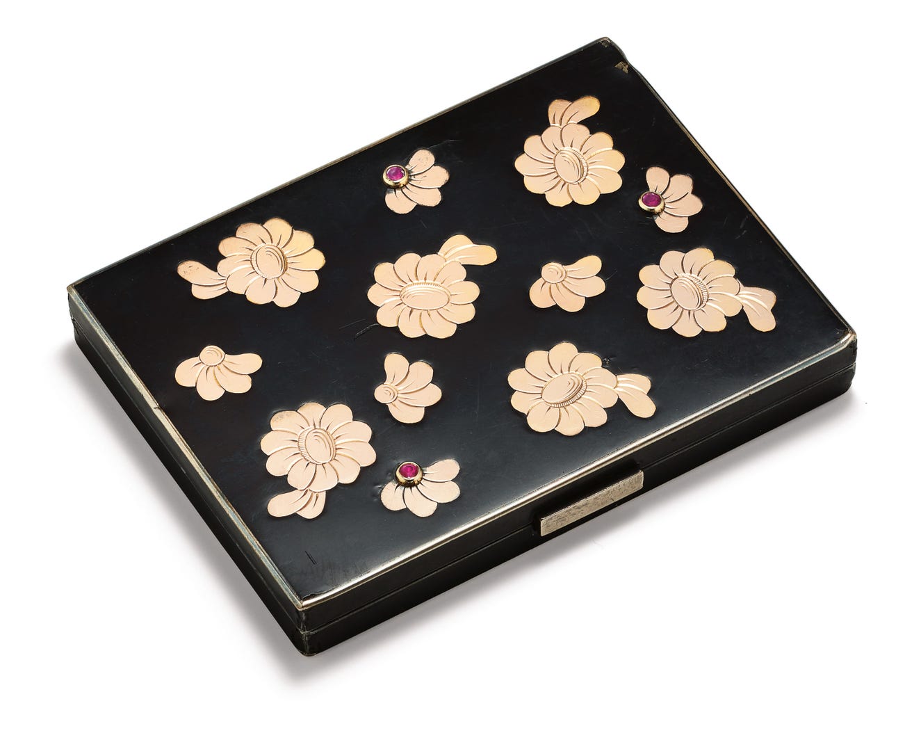 An Art Deco Lacquer, Ruby, Gold and Silver Poudrier