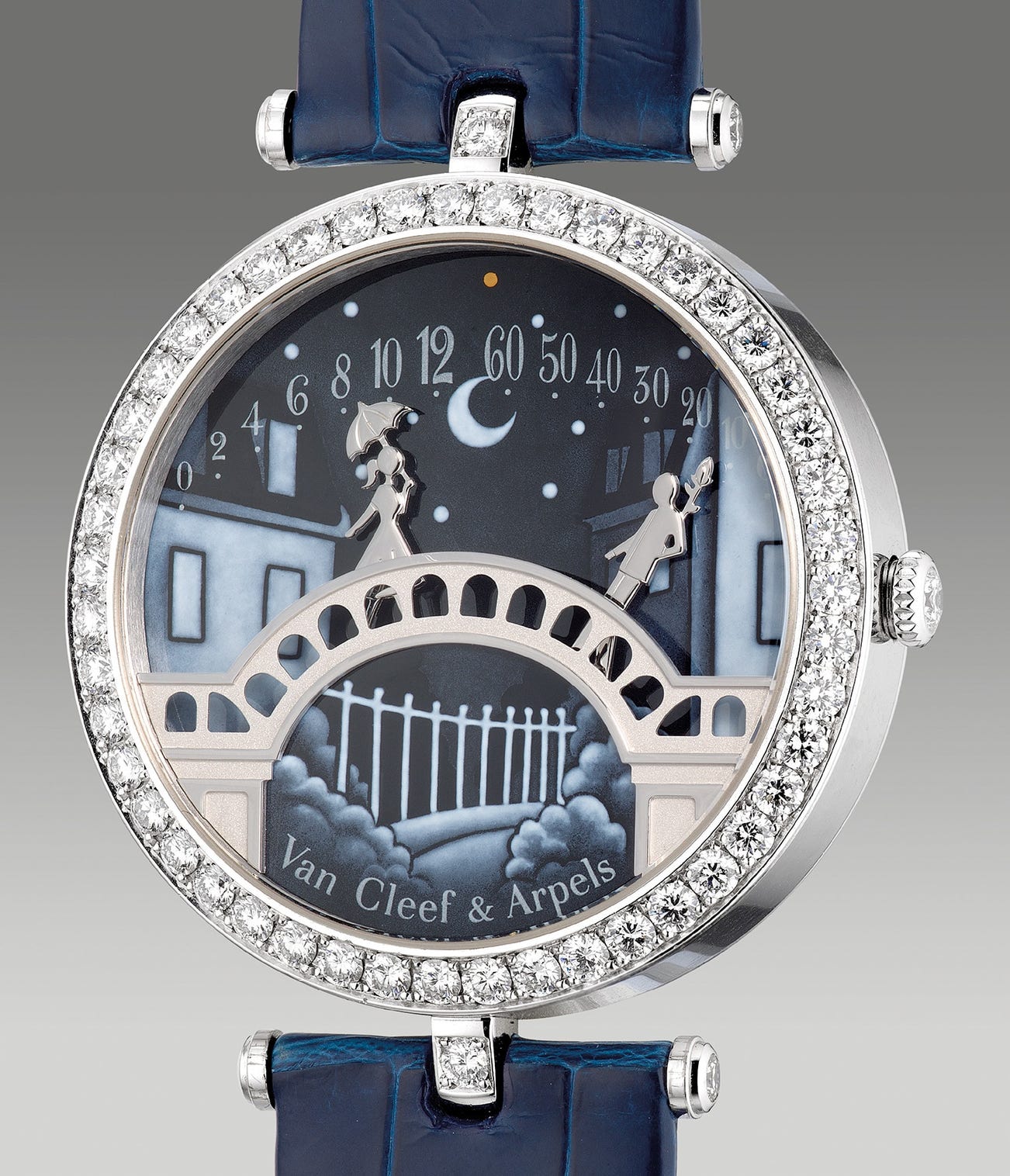 Composed with a combination of enameling, miniaturized mechanics and traditional craftsmanship, the bi-retrograde wristwatch indicates time through depictions of love with two lovebirds set on the scenes of France’s famous kissing bridge in Annecy. Depicting the hours on the left is a lady holding an umbrella while her lover on the opposite side indicating the minutes as they get closer until they finally meet in the middle to kiss at noon and midnight. With a beautiful backdrop of the quiet town of Annecy at night with a nocturnal night sky representing the Great Bear constellation, the dial is composed of “grisaille” enamel, an extremely hard to execute enameling technique that only the best enamellers are able to execute. Requiring a meticulous process, the technique dates back to the 16th century where master enamellers applied numerous layers of enamel generating layers of varying colors to depict the motif. The final process requires the enamel to be baked inside a kiln with temperatures between 740 and 840 degree Celsius.